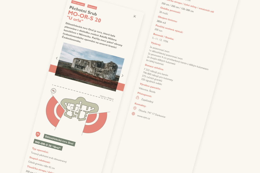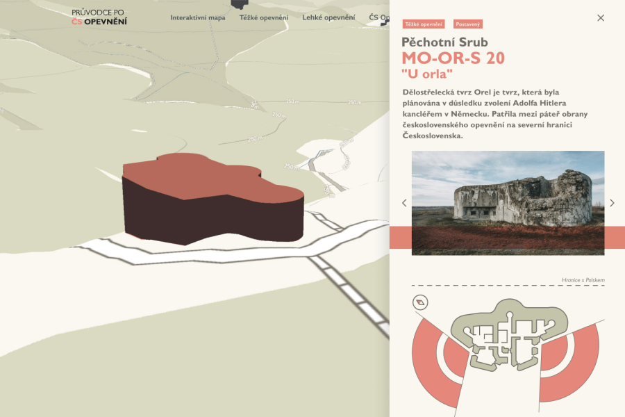 Práce se skládá z několika částí: fotografická dokumentace jednotlivých objektů opevnění, ilustrace objektů nebo výzbroje, reálná interaktivní mapa ve 3D prostoru vytvořená v aplikaci MapBox a interaktivní prototyp webové stránky na které by byla mapa umístěna. Společně tyto části tvoří ucelenou webovou prezentaci historického tématu s přesahem do moderní digitální katgorafie.