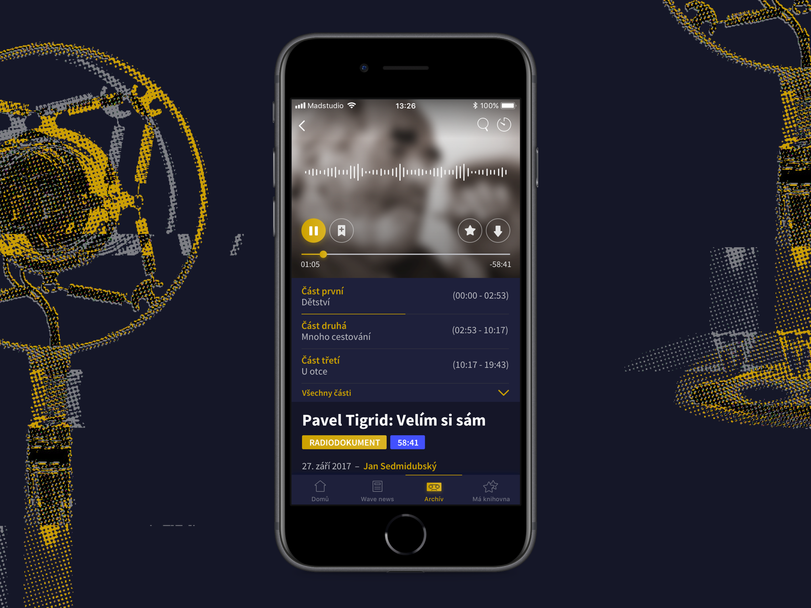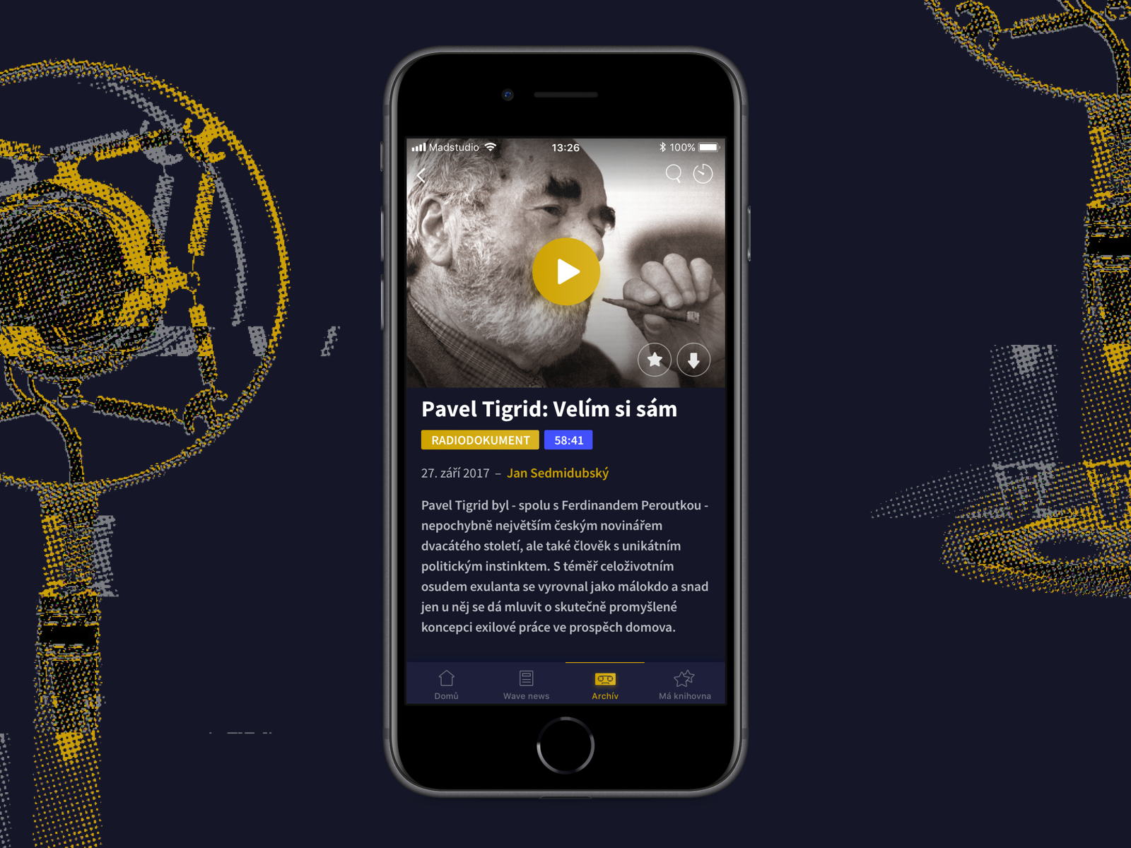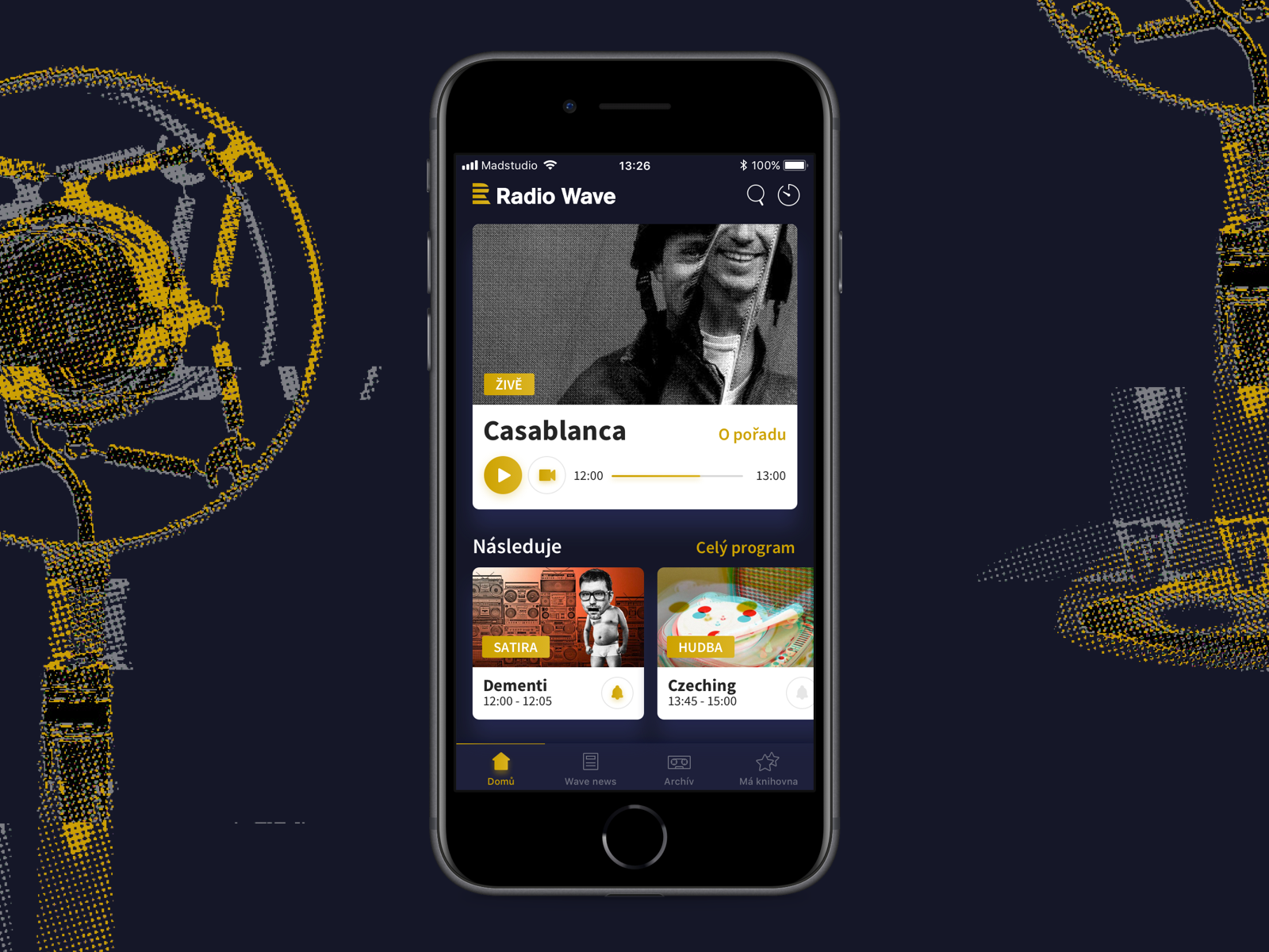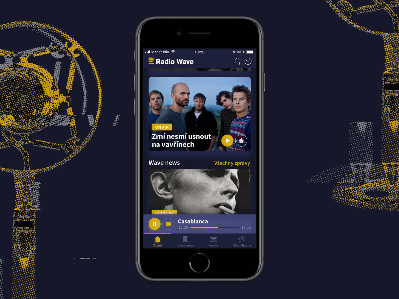 Mobilní aplikace vytvořená jako digitální hub pro radiostanici Radio Wave. Aplikace nabízí možnost žívého vysílání, personalizaci vysílání, zpravodajství rádia či archív. Náhravky z archívu jsou doplněny zajímavostmi, informacemi, přepisem a dalšími užitečnostmi.