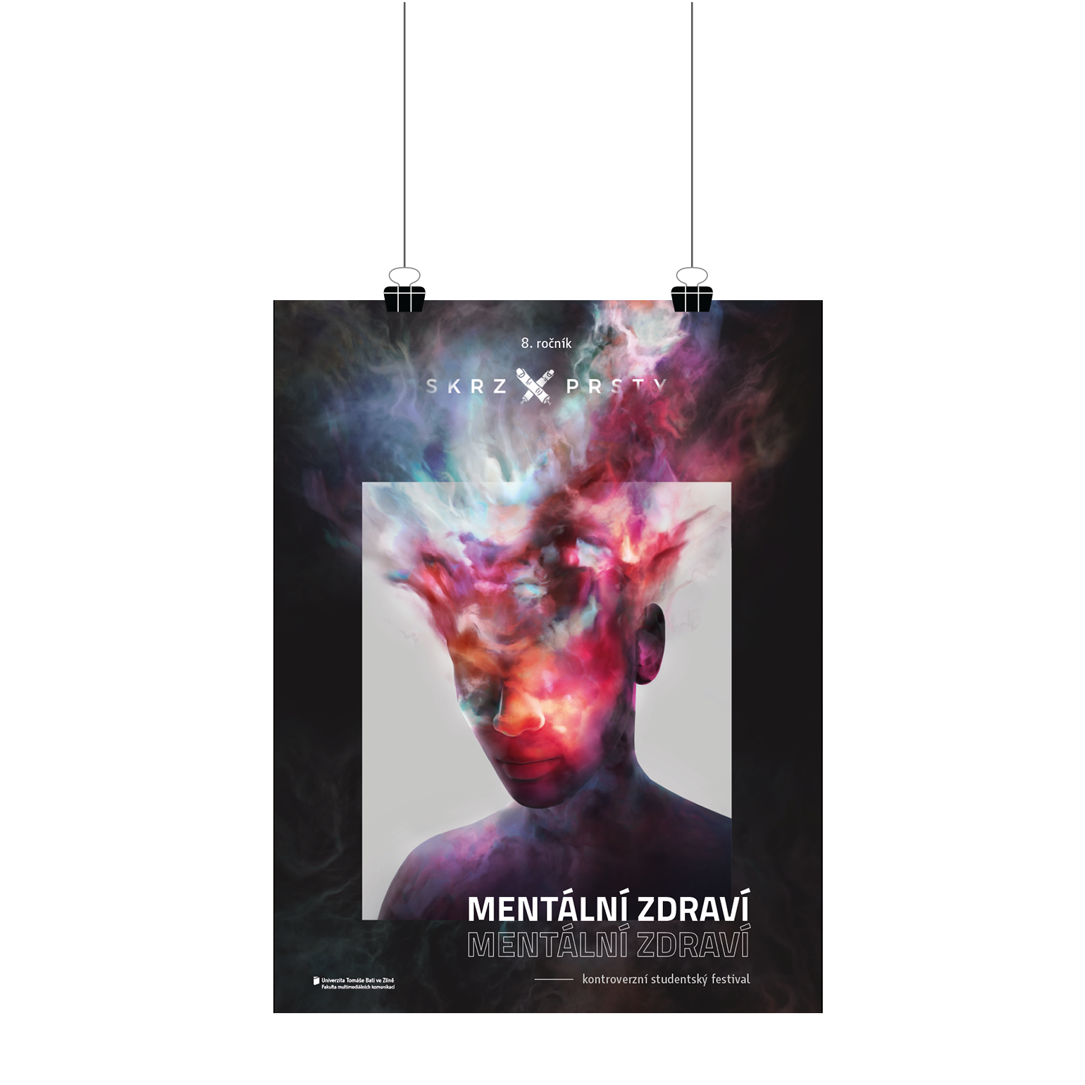 Vytvářeli jsme vizuální identitu pro další ročník studentského festivalu Skrz Prsty, který se zabývá kontroverzníma tématy. Osmý ročník se zabýval tématem mentálního zdraví. Hlavní motiv je 3D hlava neurčitého pohlaví, ve které proudí myšlenky ve formě barevné mlhoviny a následně vychází ven z hlavy do okolí. Mlhovinu dále používáme na sociálních sítích jako metaforu plujících myšlenek. Dále na plakátu používáme bílé čtverce, které symbolizují okno do duše. Celý vzhled je tmavý, protože toto téma je vážné a nemělo by se brát na lehkou váhu. Poslední grafický prvek je rozdvojené písmo, které má odrážet vnitřek a venek člověka. Vše můžete sledovat na: www.skrzprsty.cz www.instagram.com/skrzprsty/