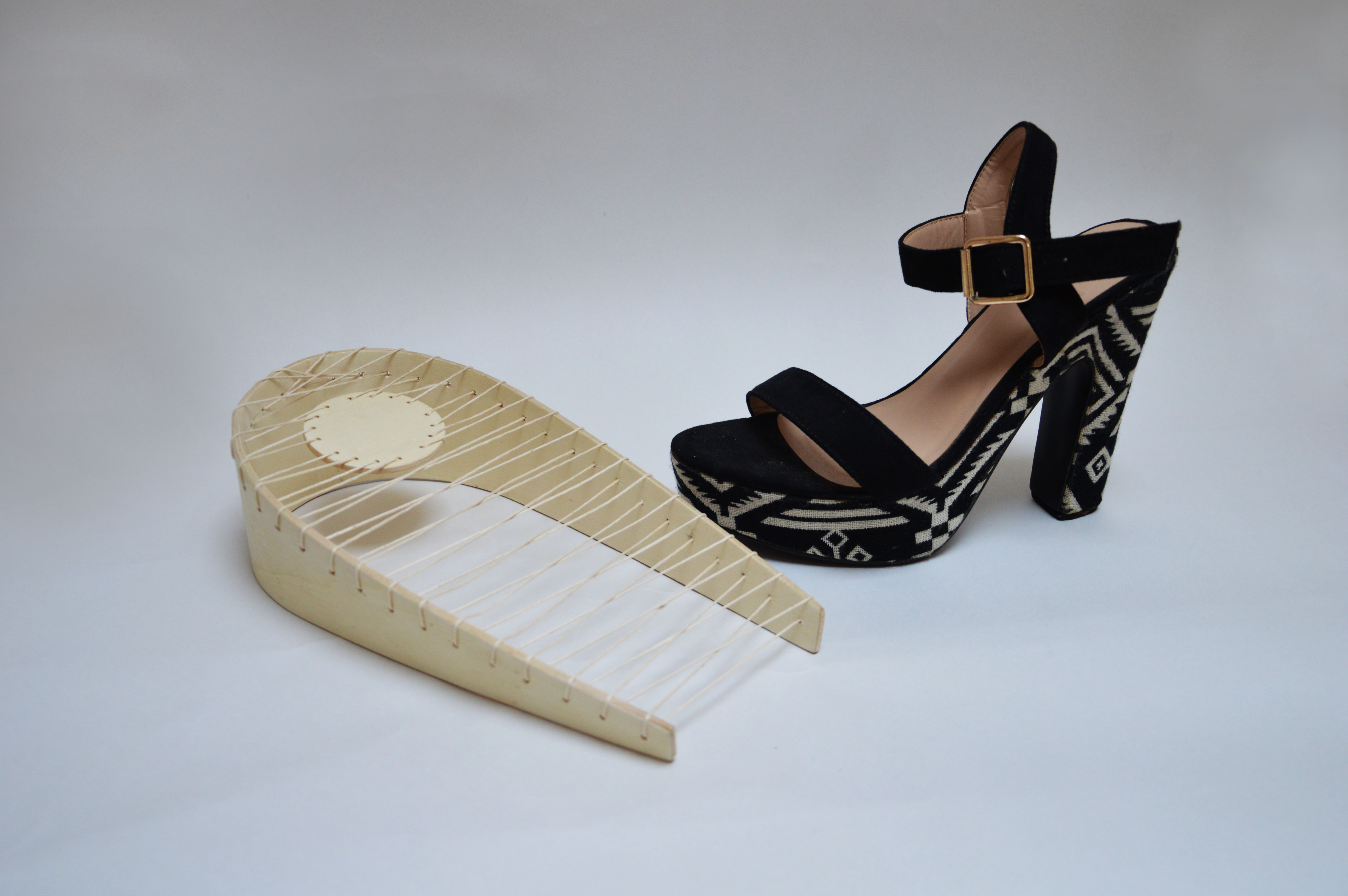 Stojan na topánky je inšpirovaný šitím a ručnou výrobou topánok. Je vyrobený z ohýbanej preglejky a šnúrky. Šnúrka drží zaoblený tvar a slúži ako protišmyková plocha, na ktorú pokladáme topánku. Na Stojan môžme umiestniť rôzne druhy topánok, čo nám umožňuje vypletený drevený kruh.