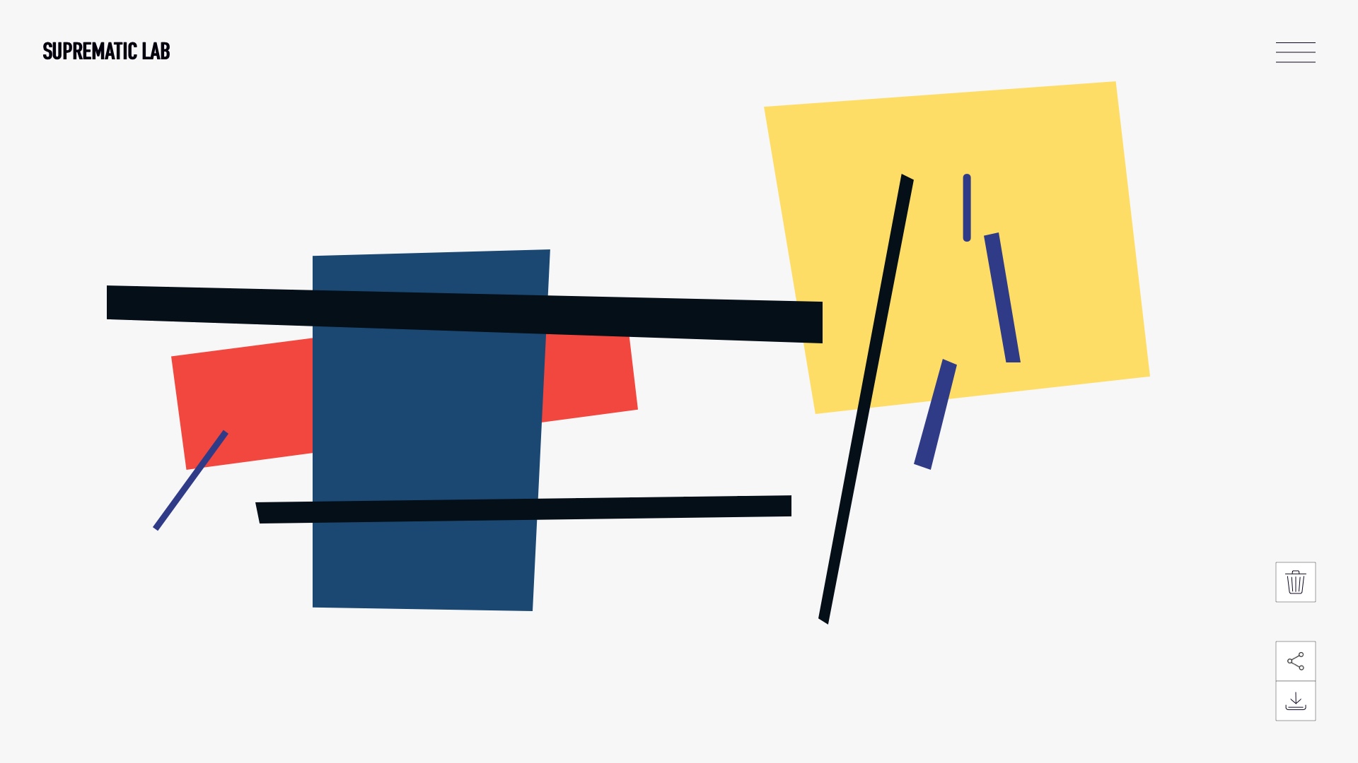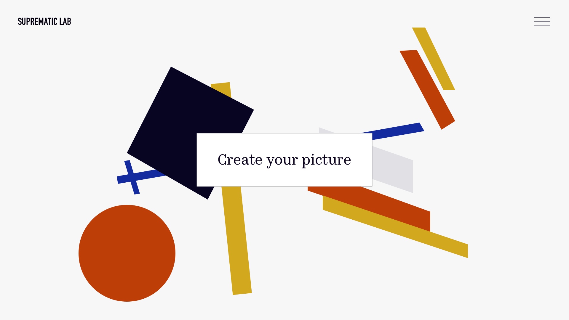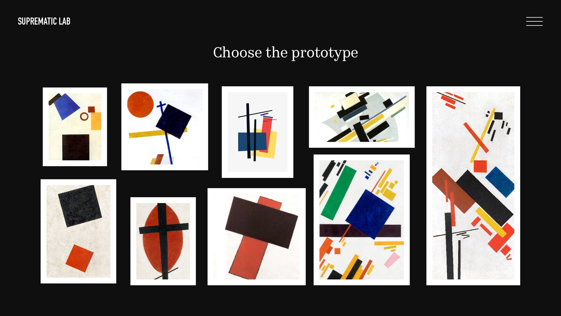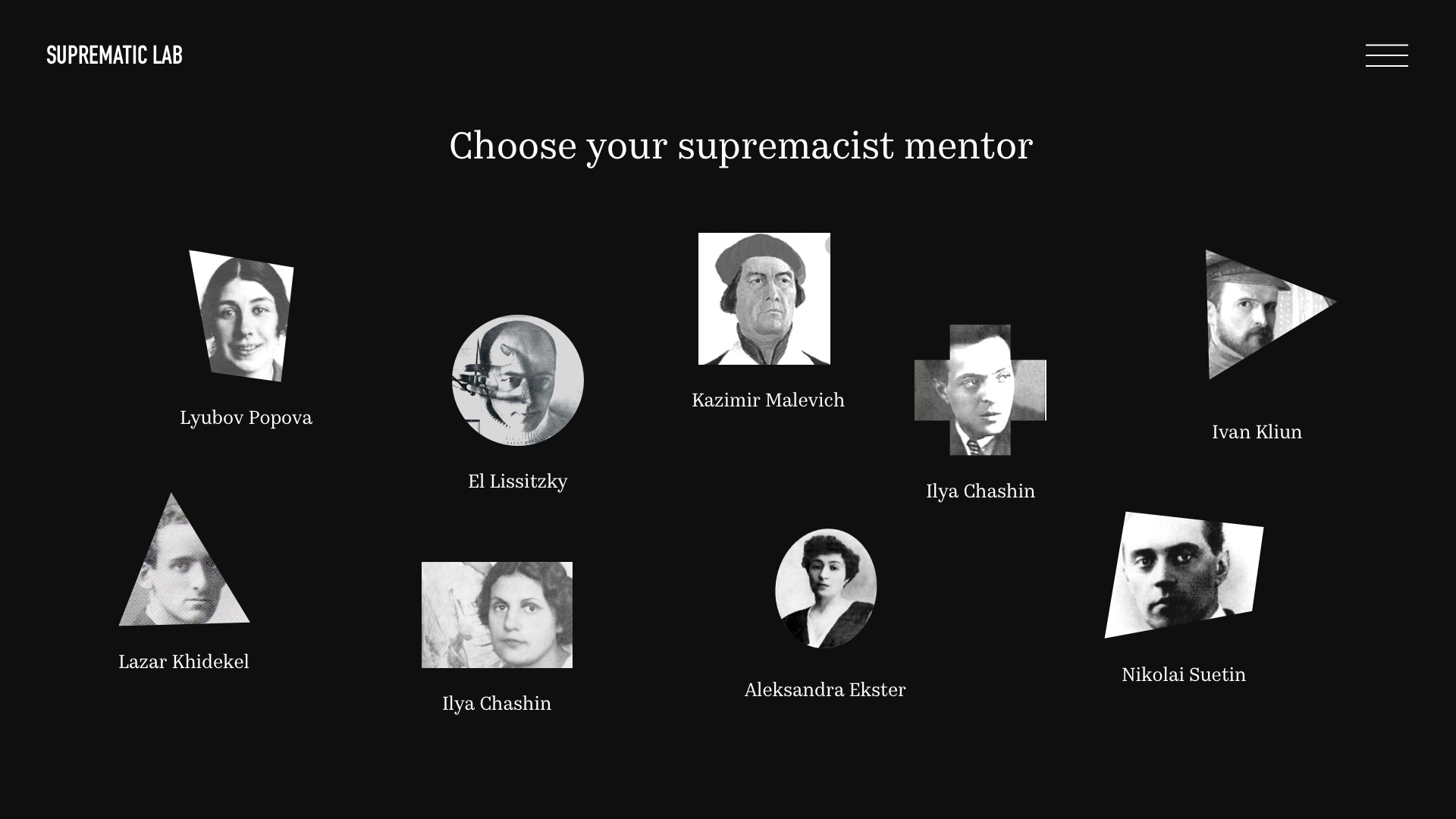 Myšlenkou mého projektu je webová stránka, na níž člověk může sám vytvořit vlastní suprimatický obraz na základě známých obrazů. Nejprve si uživatel vybere mentora (malíře), dále prototyp (malířův obraz) pro svůj budoucí obraz. Dále se obrazovka stává plátnem. Uživatel má k dispozici tvary z vybraného prototypu. Tyto tvary může uživatel přeskupit, otáčet a vytvářet vlastní kompozici. Cílem mého projektu je umožnit uživateli hravou formou pochopit kreativitu umělců suprimatismu. A také rozvíjet zájem o tuto kulturu vytvořením vlastního obrazu, který lze stáhnout nebo sdílet na sociálních sítích.