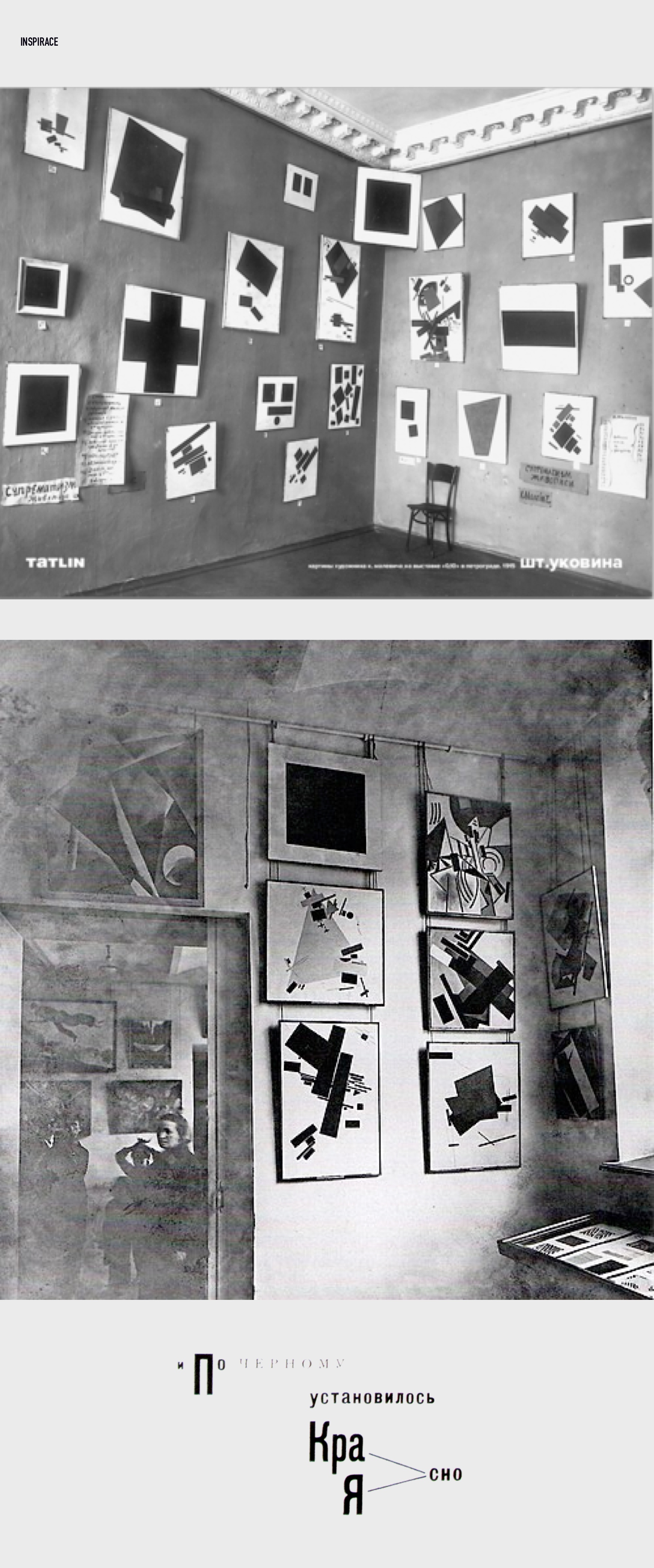 Ve své práci jsem se inspirovala archivními fotografiemi výstavy Kazimira Maleviče (zakladatele suprimatismu) z roku 1915 v Petrohradě. Pro nalezení vhodného páru písma jsem si prohlížela plakáty Ela Lisického a dalších umělců té doby.