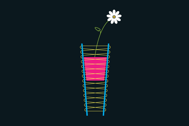 Váza ze dvou plastových desek propojená pomocí umělohmotné struny.