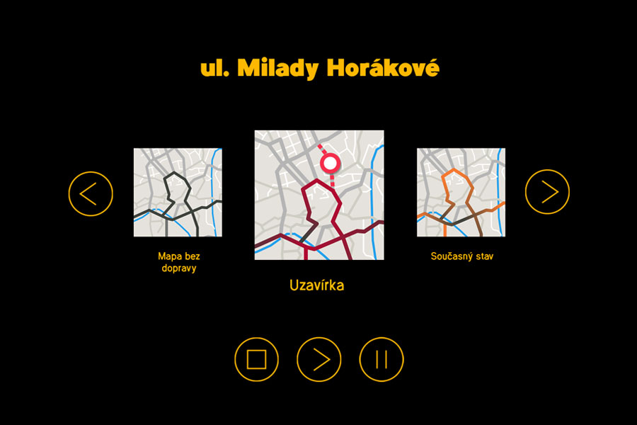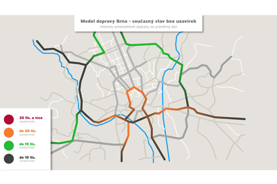Znázornění dopravní situace v centru města Brna po uzavírce ul. Milady Horákové.
