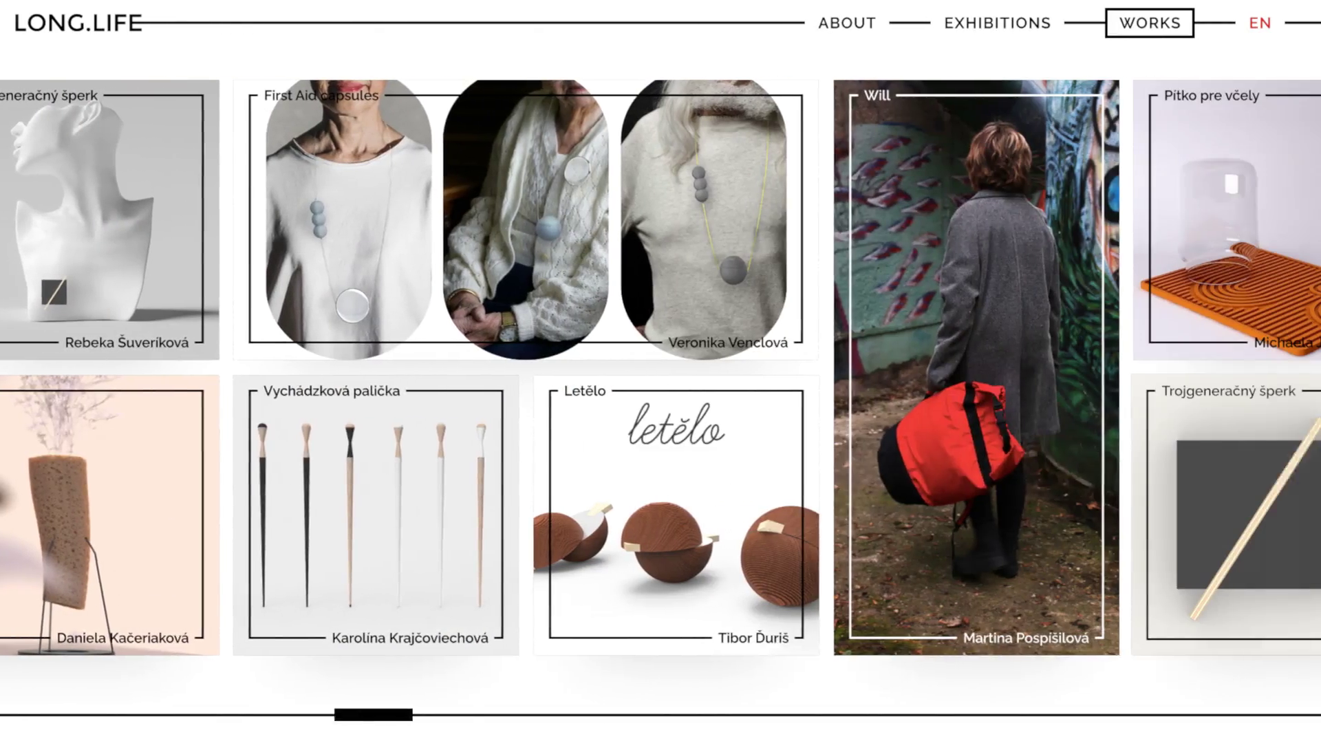 Středobodem mého návrhu je jednoduchý logotyp LONG.LIFE s protaženou střední linií E. Tato linie se objevuje napříč celým vizuálem a symbolizuje dlouhověkost, stabilitu, ale i schopnost přizpůsobit se různým prostředím. Barevnost jsem zvolil čistě černobílou, jednak z důvodu čitelnosti, jednak proto, že projekt funguje hlavně jako médium, ve kterém ostatní designéři sdílí své výstupy, neměl by je tedy vizuálně přehlušit. Součástí návrhu je web, katalog, postery, pozvánka, profily na sociálních sítích a propagační předměty.