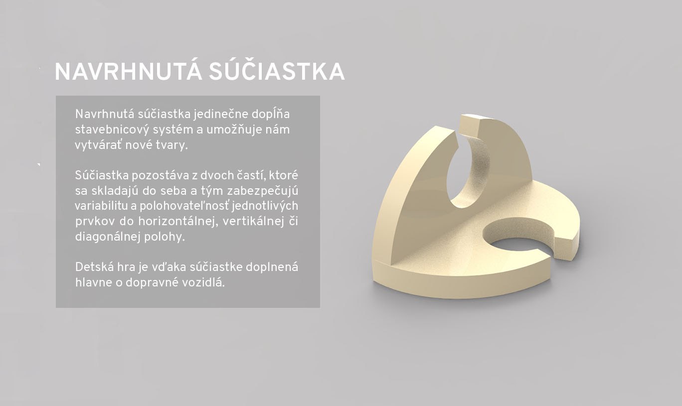 Navrhnutá súčiastka jedinečne dopĺňa stavebnicový systém a umožňuje nám vytvárať nové tvary. Súčiastka pozostáva z dvoch častí, ktoré sa skladajú do seba a tým zabezpečujú variabilitu a polohovateľnosť jednotlivých prvkov do horizontálnej, vertikálnej či diagonálnej polohy. Detská hra je vďaka súčiastke doplnená hlavne o dopravné vozidlá.