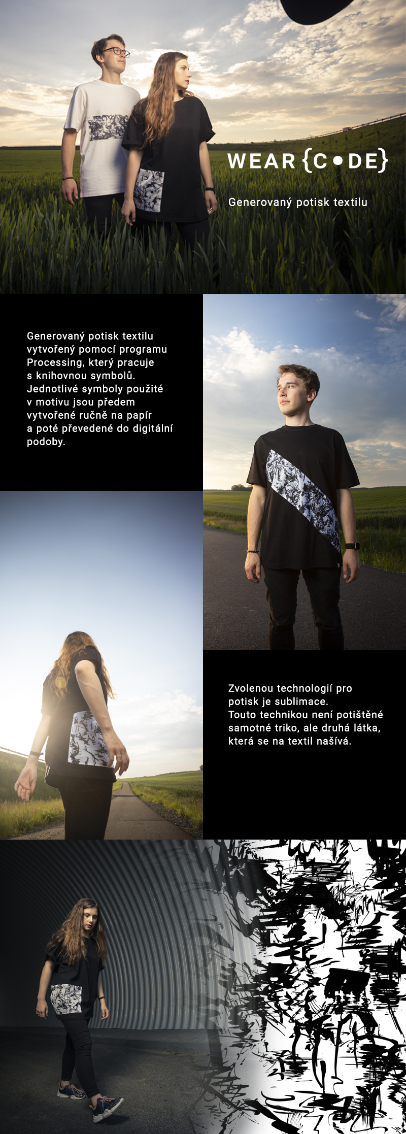 Hlavní myšlenkou mé práce je originalita a práce s náhodným uspořádáním prvků do jednotného vzoru, který je následně vytisknutý a našitý na tričko. Každý kus je originál, neexistuje šance, že by na světě byly dvě totožná trička.