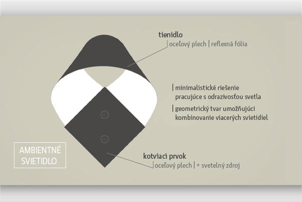 Konštrukcia svietidla je tvorená z dvoch častí, a to tienidlom a kotviacim prvkom. Oba sú navrhnuté z oceľovej pásoviny, ideálne o hrúbke 0.55mm. Rozmerové parametre počiatočného materiálu sú 100 x 700 mm pre tienidlo a 142 x 284 mm pre kotviaci prvok. Pričom pri výrobe nevzniká žiadny odpad. Konštrukcia je navrhnutá bez zvárania. Princíp spočíva v ohnutí materiálu a v prípade tienidla jeho následným nitovaním v štyroch bodoch. Na vnútornú stranu tienidla je nanesená reflexná fólia, ktorej úlohou je maximalizovať odraz svetla a zmeniť svetelnú atmosféru (záleží použitia farby). Kotviaci prvok je nositeľom tienidla, svetelného zdroja a zároveň sa prostredníctvom neho svietidlo skompletizuje a uchytí na stenu. Svetelný zdroj tvorený LED pásikom, je ukrytý vo vnútri kotviaceho prvku, pričom je chránený vrstvou opálového plexiskla o hrúbke 2mm. Ktoré zároveň slúži ako difúzor pre rozptyl svetla a vytvára tak požadovaný ambientný efekt.
