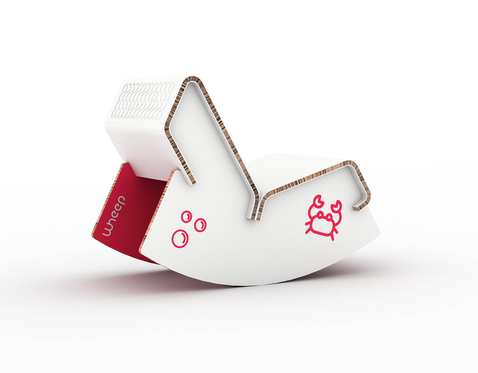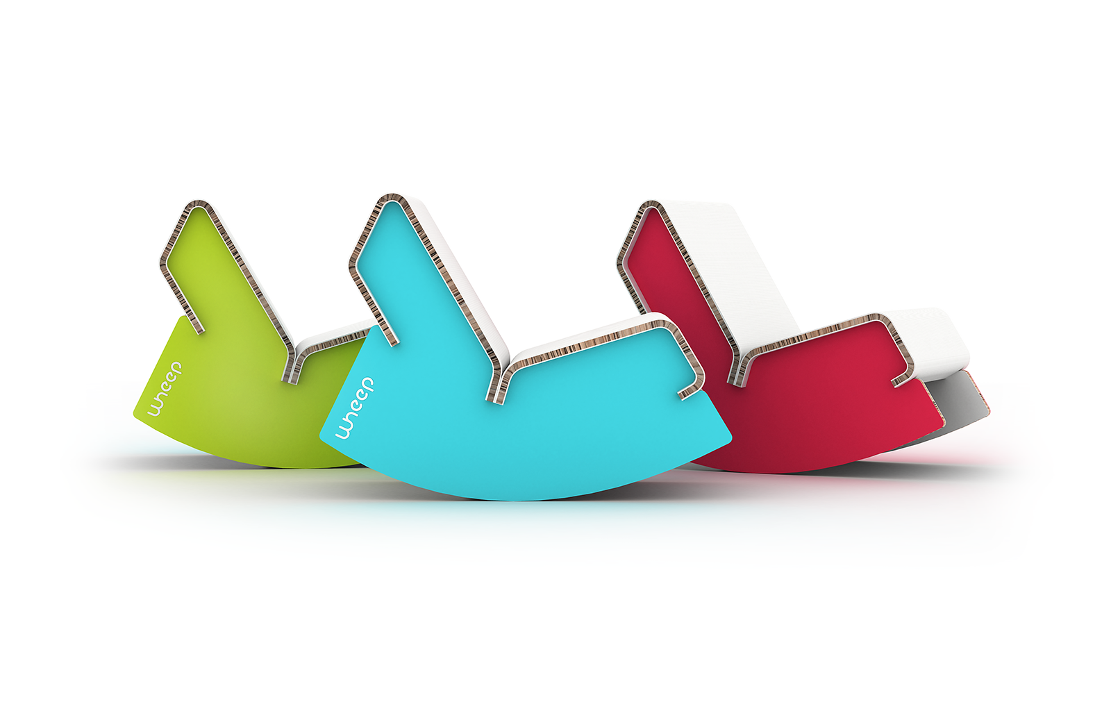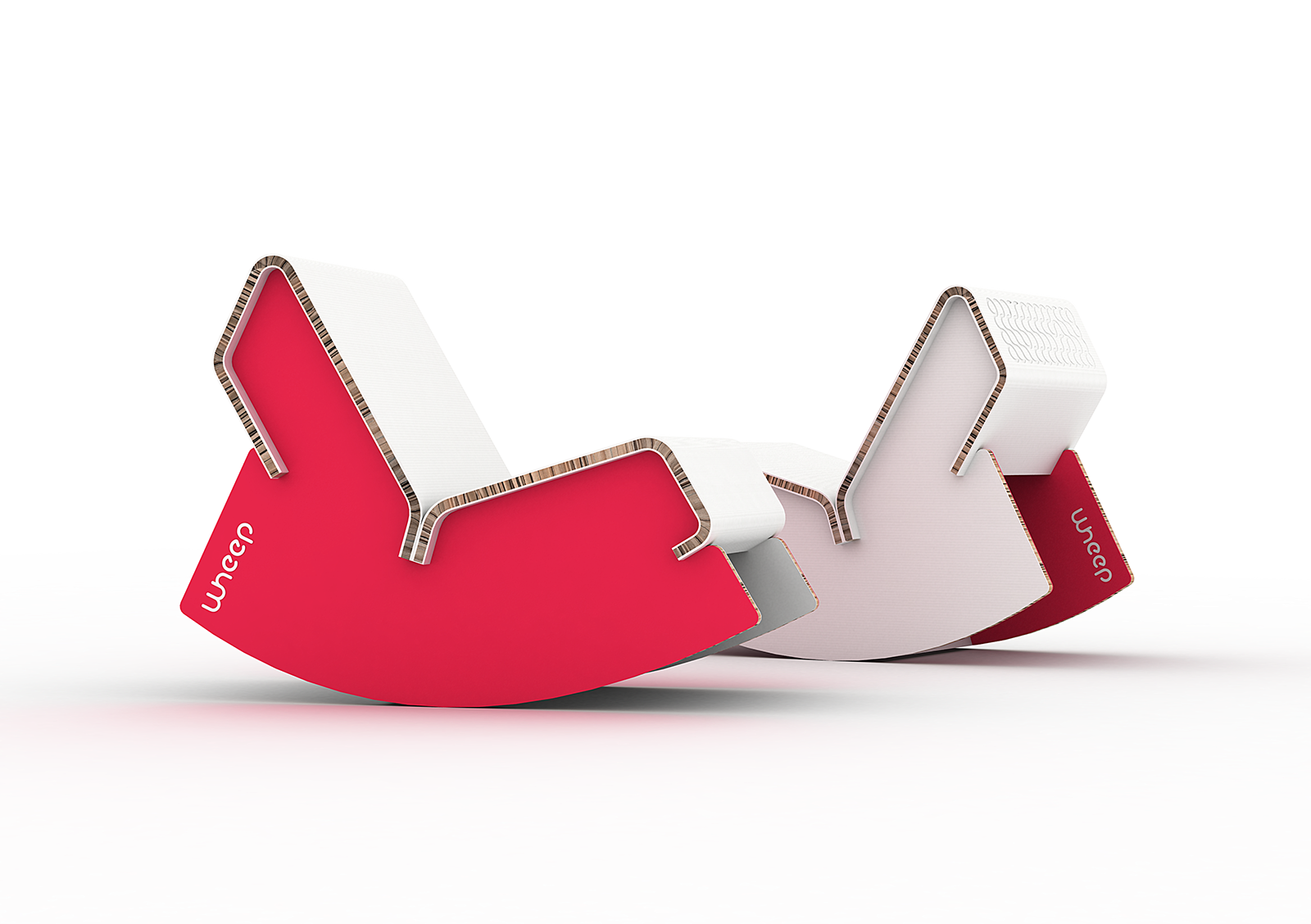 Wheep je houpací křeslo pro děti od 4 do 6 let. Celé je vyrobeno z papírové voštiny, která nabízí snadnou výrobu a ekologické zrecyklování, když dítě vyroste. Každé dítě si může své křeslo dotvořit samo pomocí originálních nálepek a kresby. Logo a vizuální styl je výsledkem spolupráce se studentem Digitálního designu.