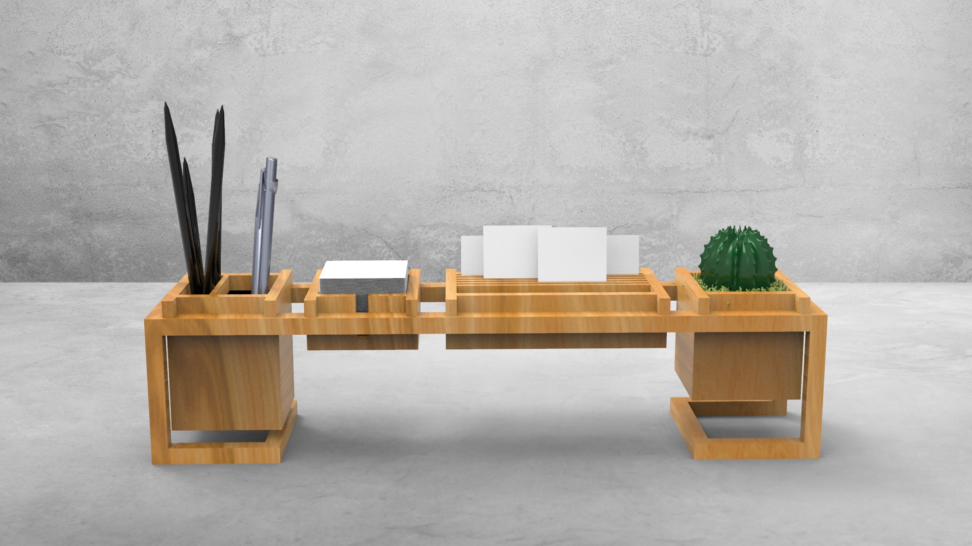 Závesná sada doplnkov na pracovný stôl vytvorená z preglejky. Je kompaktná a nezaberá veľa priestoru, keďže sa dá využiť aj ukladací priestor ktorý vzniká pod ňou. Každý kus setu sa dá v prípade potreby vybrať zo stojana.