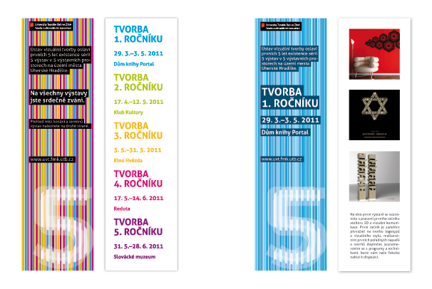 Mým záměrem bylo vymyslet co nejjednodušší vizuální styl s motivy opartové pětky. Celý vizuální styl jsem založila na jednoduchých barvách a jejích odstínech, které se dají seskupit v jeden vícebarevný plakát. Jako další reklamní předměty a součást propagace jsem zvolila odznaky a samolepky.