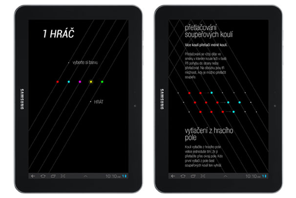 Logická hra zpracovaná pro tablet Samsung. Cílem je vytlačit z hrací plochy šest soupeřových koulí.Programoval Tomáš Veselý.