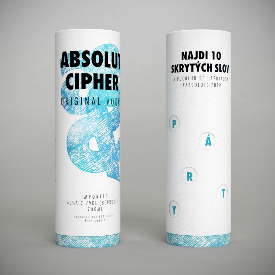 Dárkový obal na vodku. Při otáčení vnějšího válce lze nalézt určité slova spojená s produktem. Cílem je nalézt 10 různých slov.