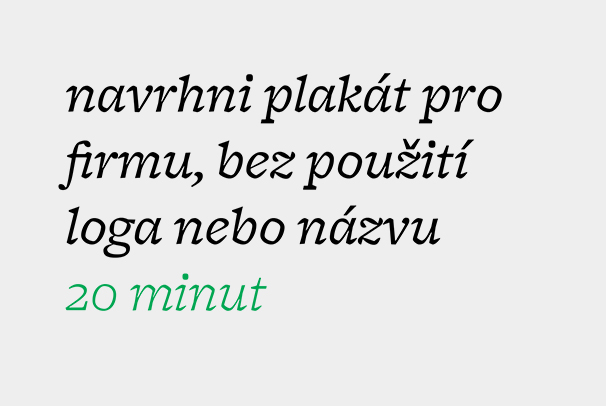 Časově omezené cvičení bez předešlé znalosti zadání. Záměrem byla shaha o potlačení perfekcionismu, využití naléhavého deadlinu jakožto efektivního nástroje.