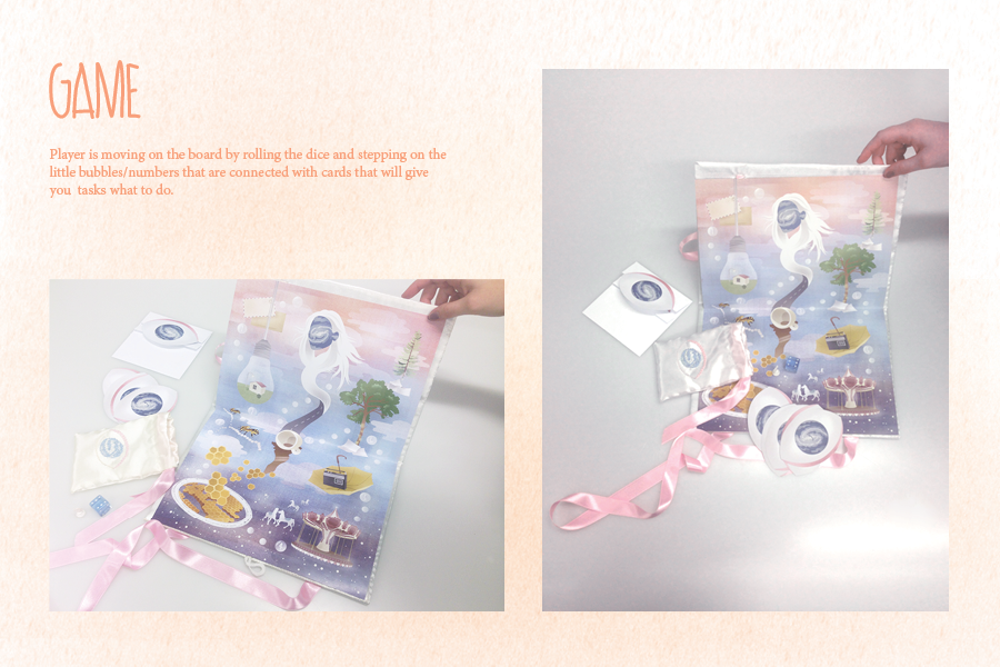 Svoj „atlas inspirácie“ som poňala ako spoločenskú hru pre jedného, kde „sled emocionálne pôsobiacich udalostí“ predstavuje cestu (políčka), po ktorej sa človek – panáčik pohybuje na základe čísla, ktoré hodí kockou.