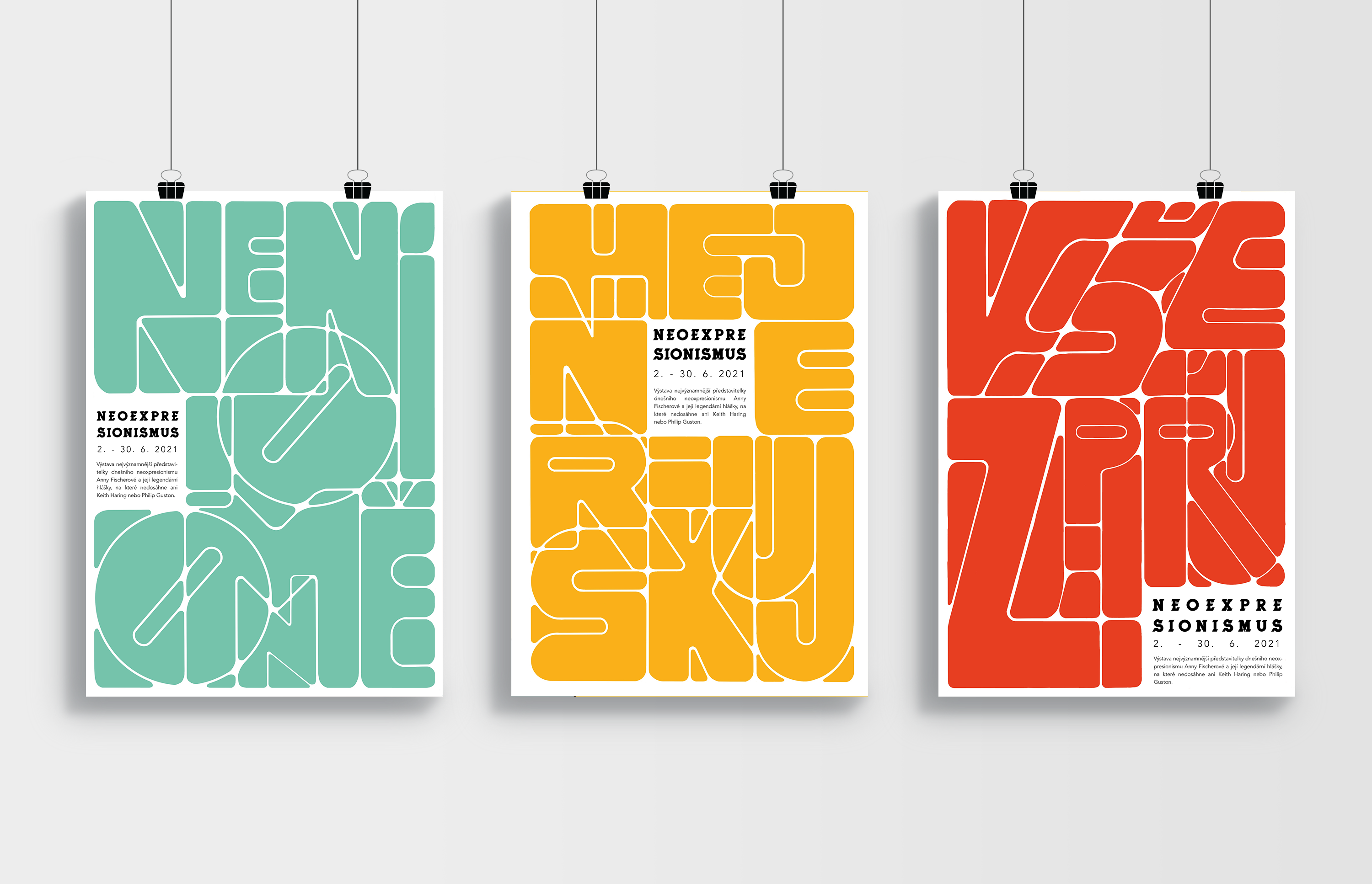 Plakáty vytvořené pomocí skloubení písmen do sebe.