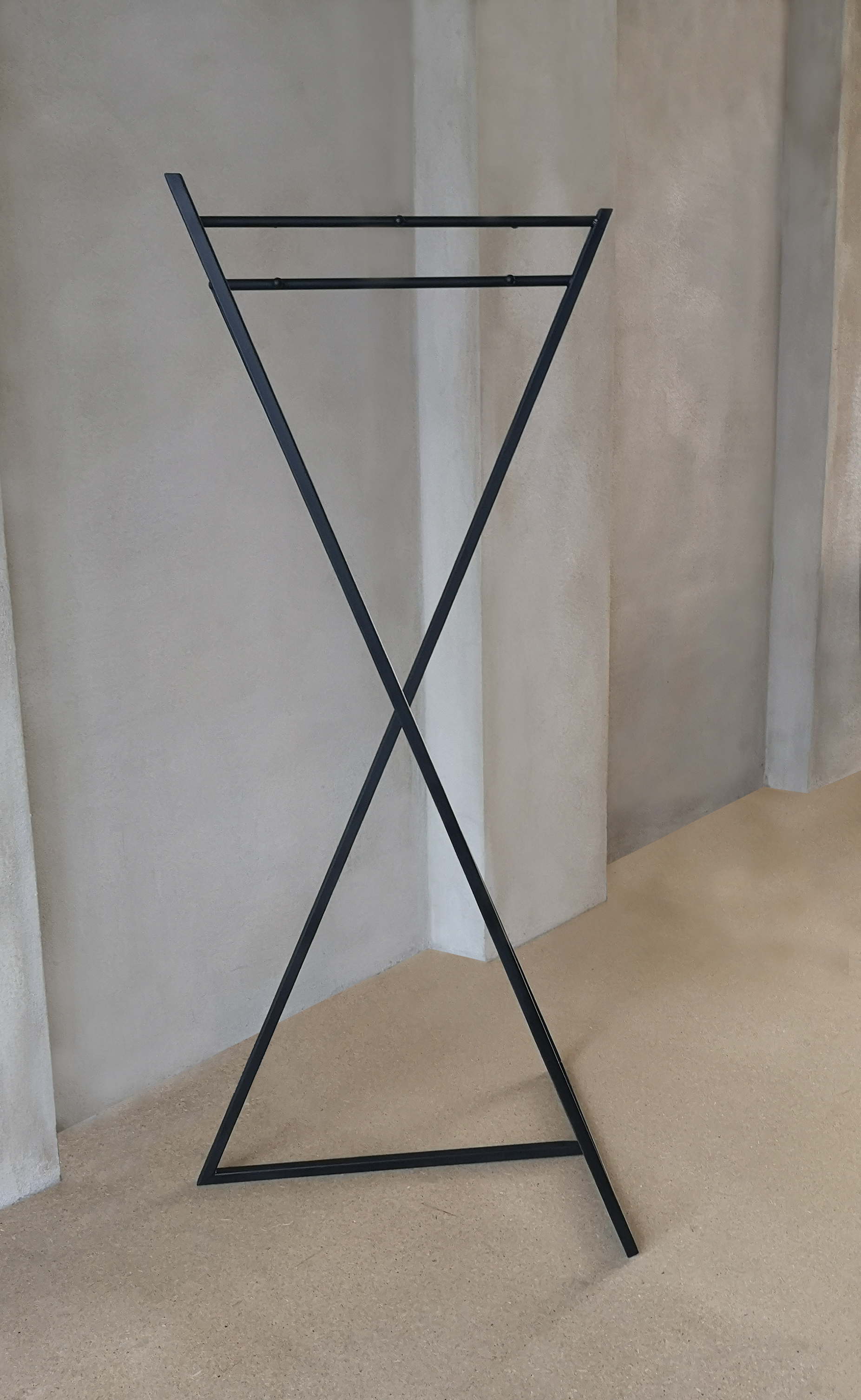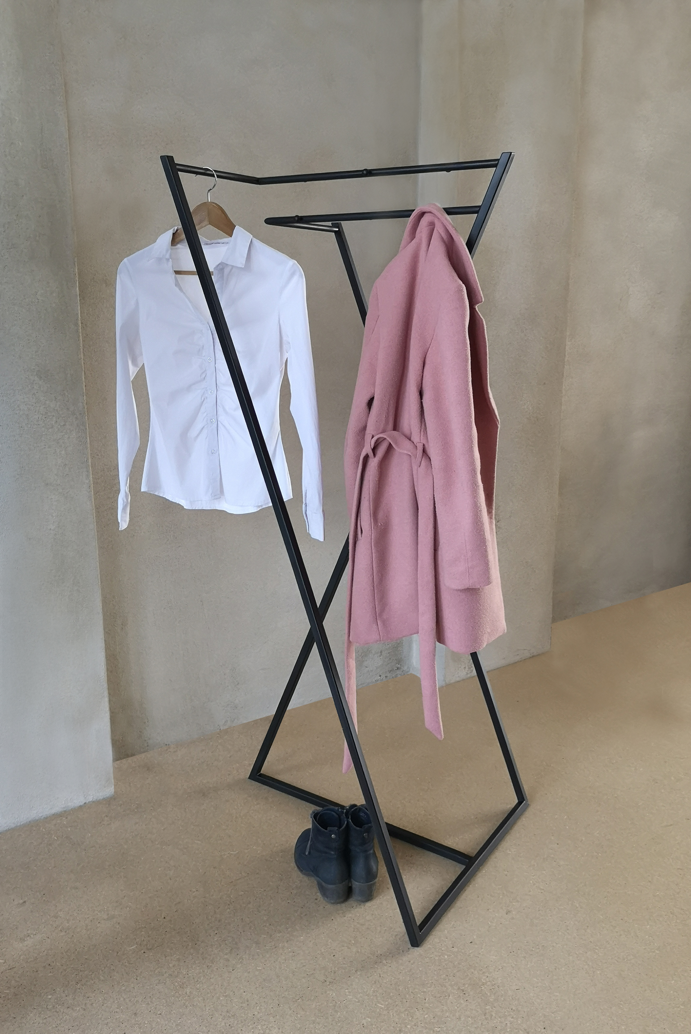 Věšák je navrhnut tak, aby působil jednoduše a čistě a nerušil, když se na něj pověsí různobarevné oblečení. Lze jej umístit ke zdi i do prostoru. Pohled z boku nám připomíná přesýpací hodiny, z přední strany uvidíme dva pomyslné obdélníky, kdy je jeden nižší. V horní části je šest háčků ve tvaru koulí. Umístěny jsou po obou stranách kulatin po třech pro lepší věšení. Boční části kulatin jsou určeny na zavěšení oblečení na ramínkách, případně na zavěšení deštníků či šál. Lze zavěsit 4–8 ramínek dle rozměrů věšeného oblečení.