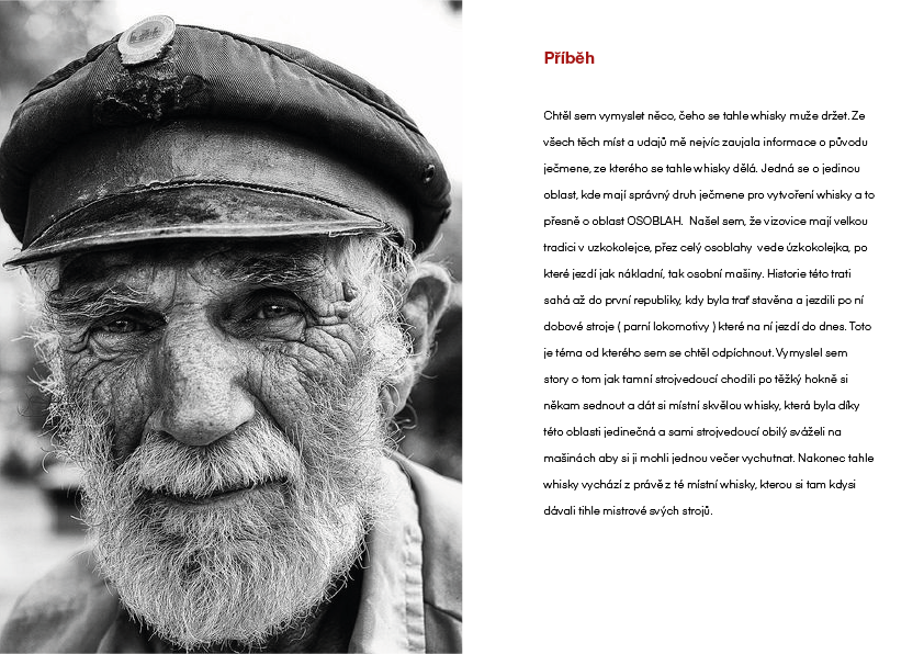 Chtěl sem vymyslet něco, čeho se tahle whisky muže držet. Ze všech těch míst a udajů mě nejvíc zaujala informace o původu ječmene, ze kterého se tahle whisky dělá. Jedná se o jedinou oblast, kde mají správný druh ječmene pro vytvoření whisky a to přesně o oblast OSOBLAH. Našel sem, že vizovice mají velkou tradici v uzkokolejce, přez celý osoblahy vede úzkokolejka, po které jezdí jak nákladní, tak osobní mašiny. Historie této trati sahá až do první republiky, kdy byla trať stavěna a jezdili po ní dobové stroje ( parní lokomotivy ) které na ní jezdí do dnes. Toto je téma od kterého sem se chtěl odpíchnout. Vymyslel sem story o tom jak tamní strojvedoucí chodili po těžký hokně si někam sednout a dát si místní skvělou whisky, která byla díky této oblasti jedinečná a sami strojvedoucí obilý sváželi na mašinách aby si ji mohli jednou večer vychutnat. Nakonec tahle whisky vychází z právě z té místní whisky, kterou si tam kdysi dávali tihle mistrové svých strojů.