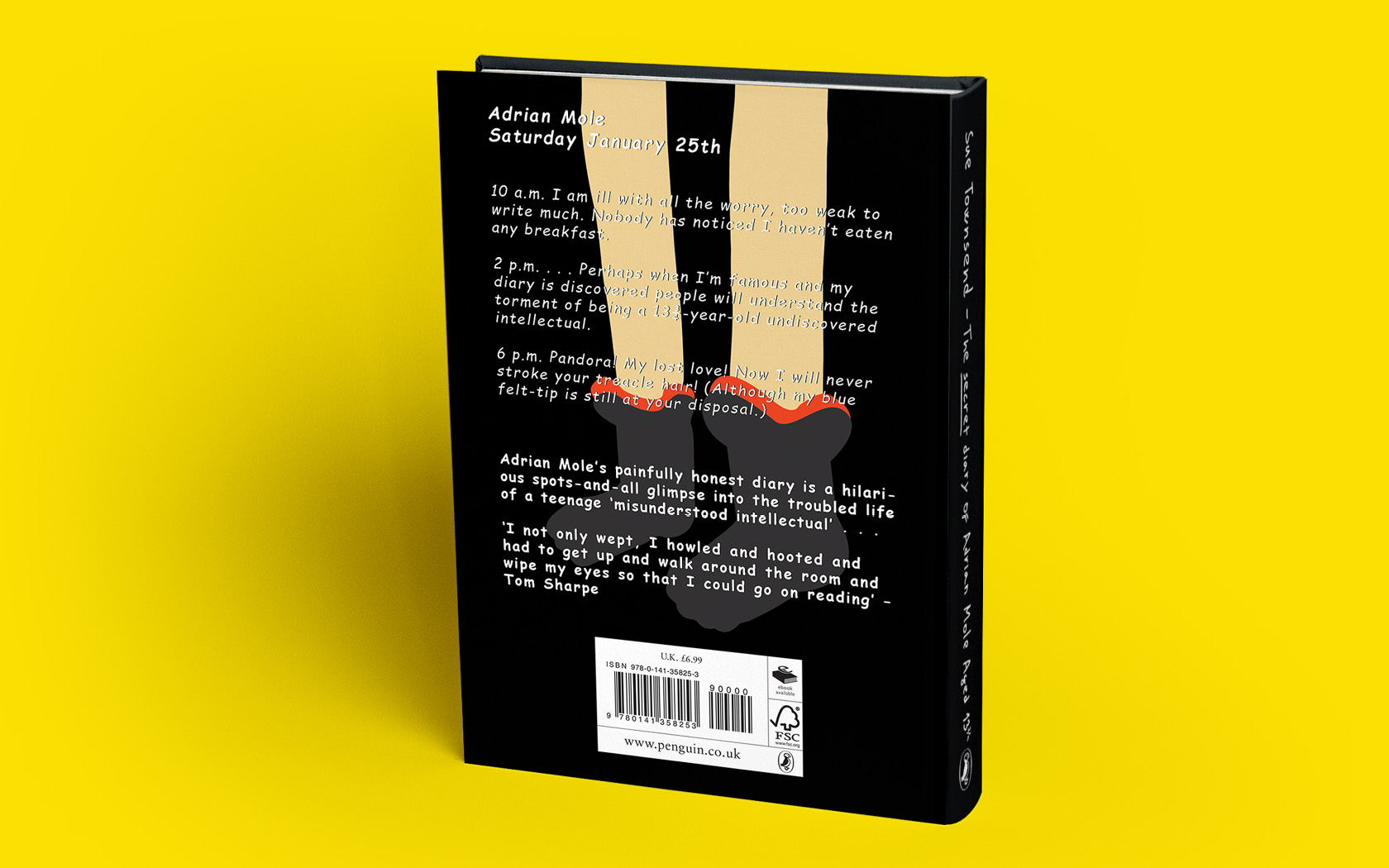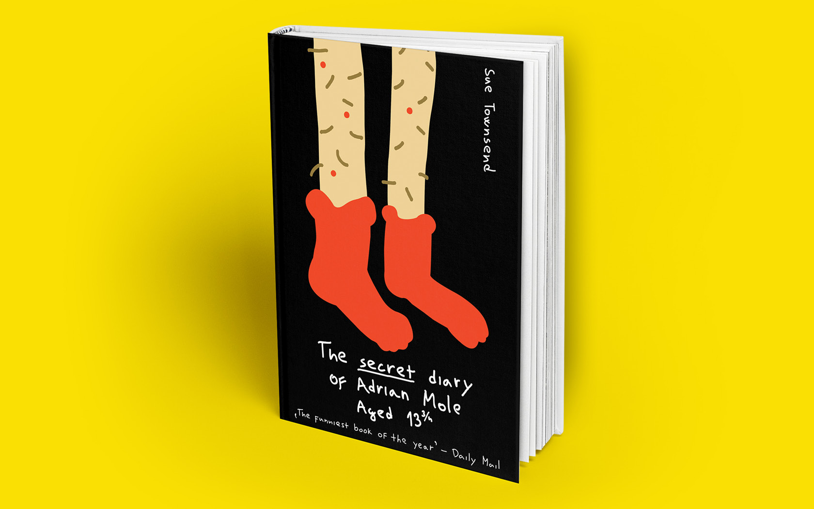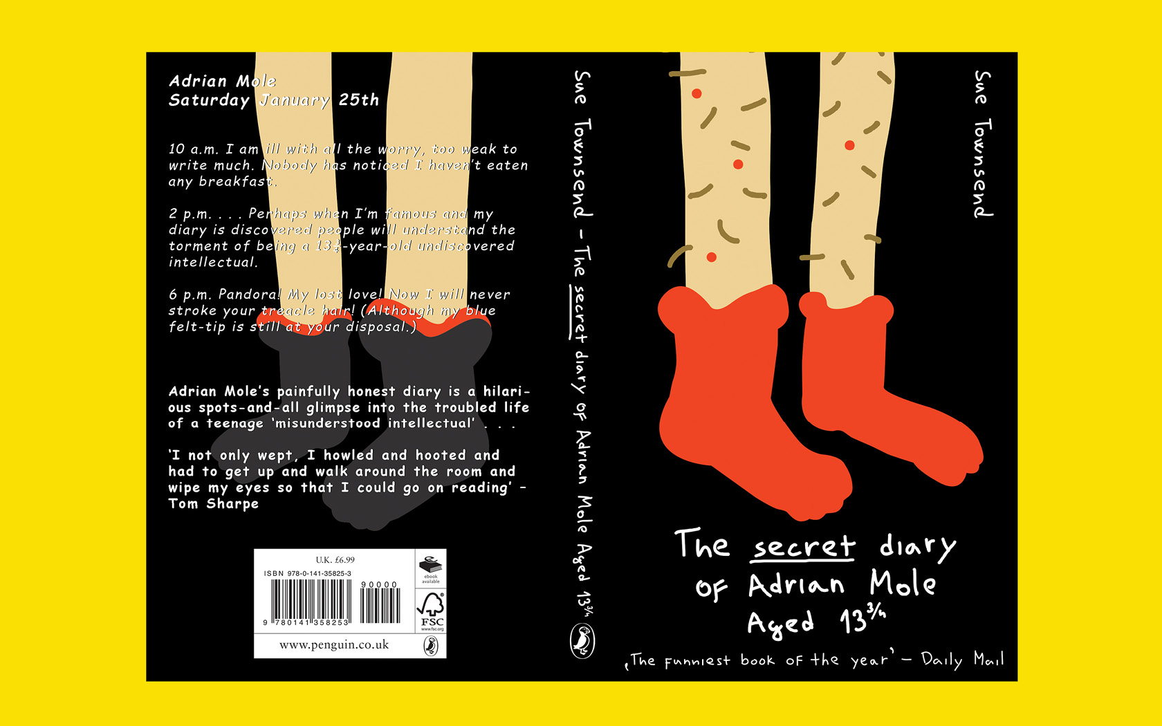 Na přední stránce jsou Adrianovy nohy v červených ponožkách, které způsobili v půlce knihy poprask. Chlupy na nohou jsou symbolem dospívání a červené pupínky připomínají jeho problém s akné. Na zadní straně jsou nohy jeho přítelkyně Pandory. Černé pozadí je stejné jako barva, kterou si Adrian vymaloval svůj pokoj. Při rozložení knihy stojí Adrian a Pandora vedle sebe. Písmo je ručně psané jako by ho psal sám Adrian.