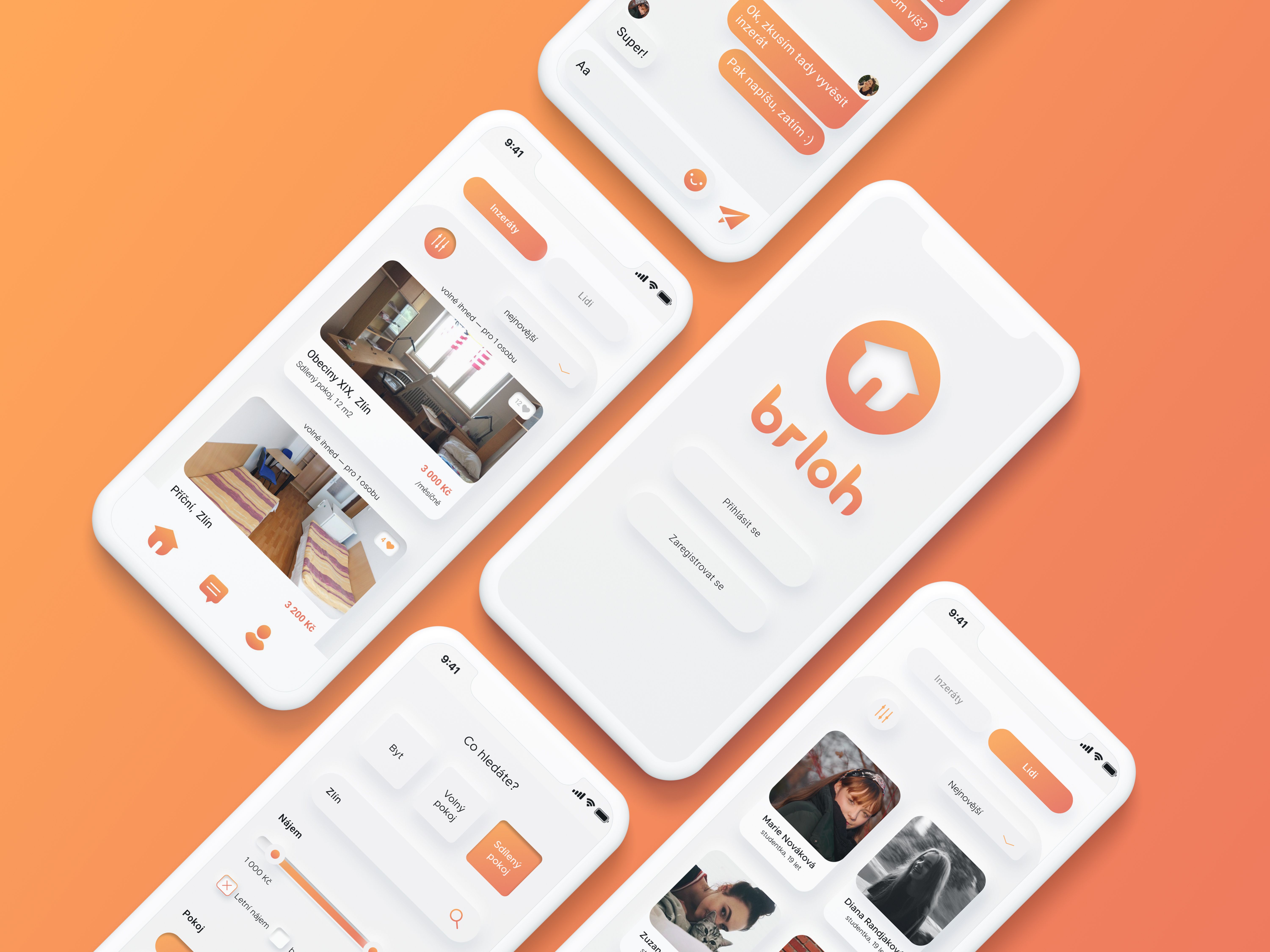 Jako úkol jsem se rozhodla vytvořit aplikaci, která se zabývá pronajímáním realit pro studenty. Jelikož jsem sama studentka, vím, že taková věc na českém trhu chybí. Většinou když student hledá bydlení, nemůže se v inzerátech dočíst, jestli majitelé pronajímají byt i pro studenty, a když už se stěhuje, třeba do sdíleného pokoje, nemusí nutně zjistit, kdo na bytě už žije. Tyto problémy by měl vyřešit Brloh! Brloh nabízí vytvoření profilu, vyvěšení inzerátu a také vytváření skupin spolubydlících. Aplikaci mohou využívat nejen studenti, ale také majitelé a realitní kanceláře. Samotný design jsem se snažila mít vhodný pro všechny věkové kategorie. Zvolila jsem červenooranžový přechod, který vyvolává teplo domova. Také jsem se snažila, aby vše působilo čistě i přes někdy nevkusné fotky inzerátů.