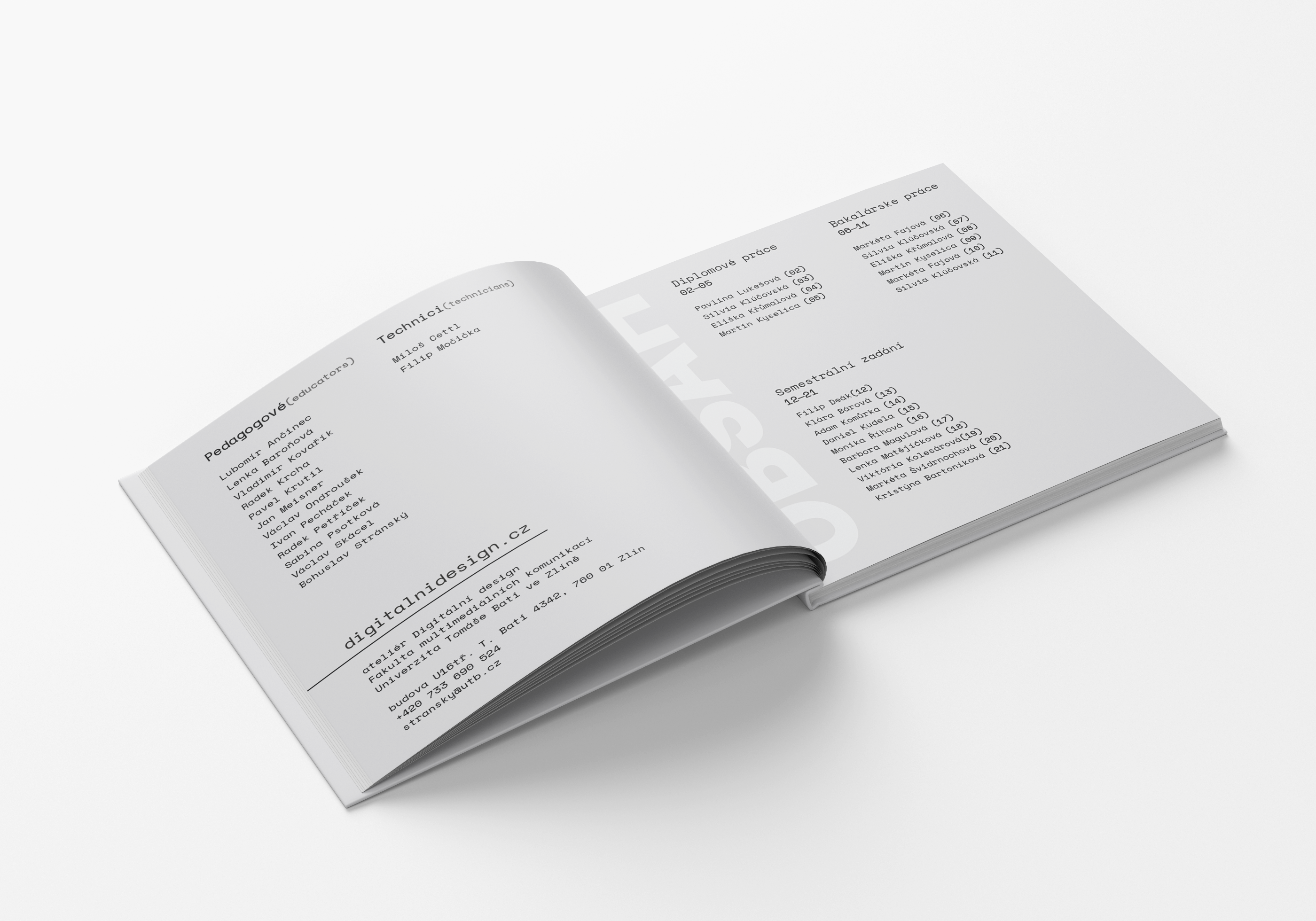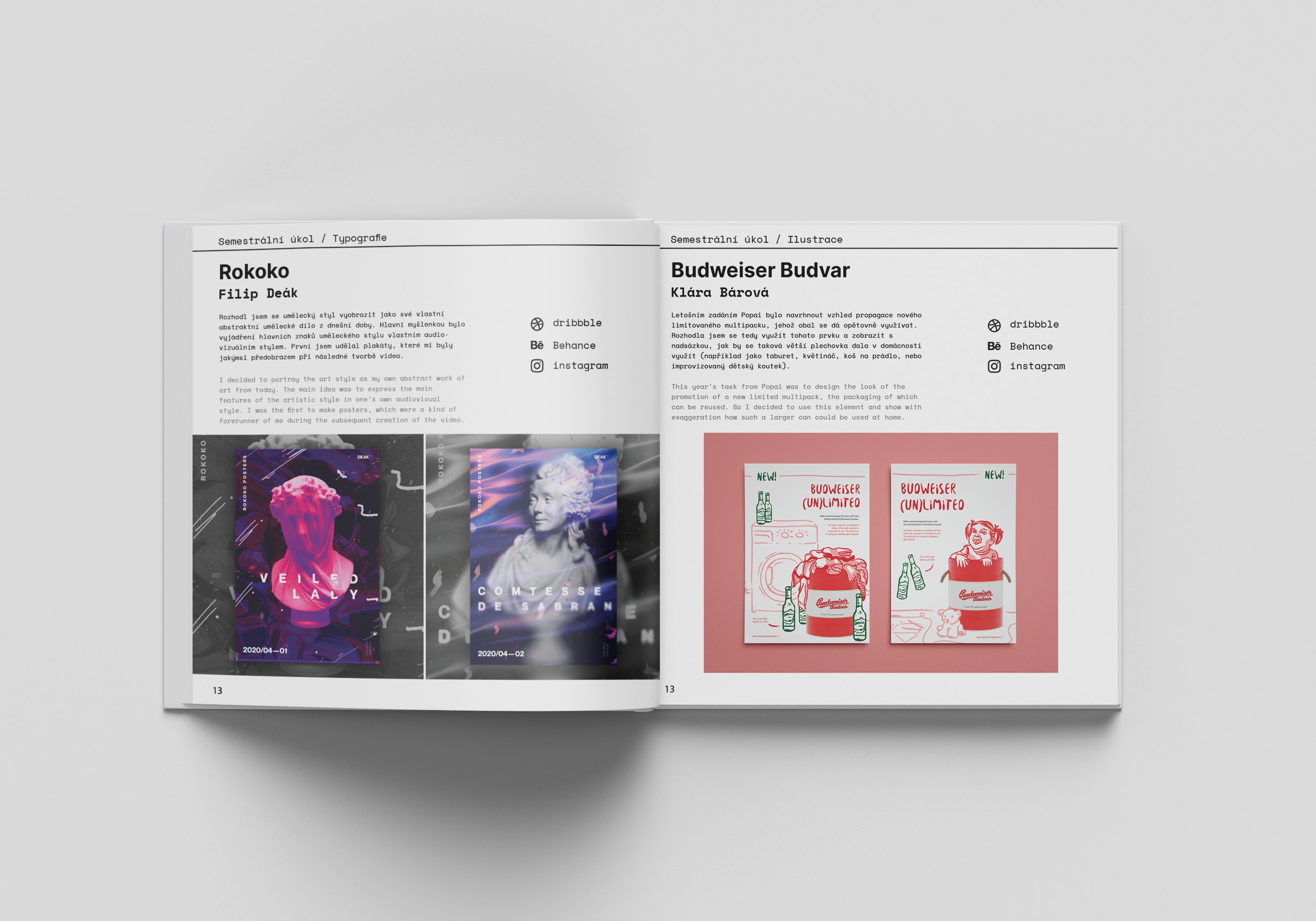 Brožúra v tlmených farbách má kontrastovať s rgb spektrom ktoré má výrazné a sýte farby. Layout je utvorený z niekoľkých druhov šablón, ktoré je možné použiť na projekty s rôznym rozsahom a množstvom obrazových výstupov. Stránky niektorých projektov obsahujú QR kód, ktorý odkazuje buď na prototyp práce, alebo spúšťa jej prípadné ar funkcie.