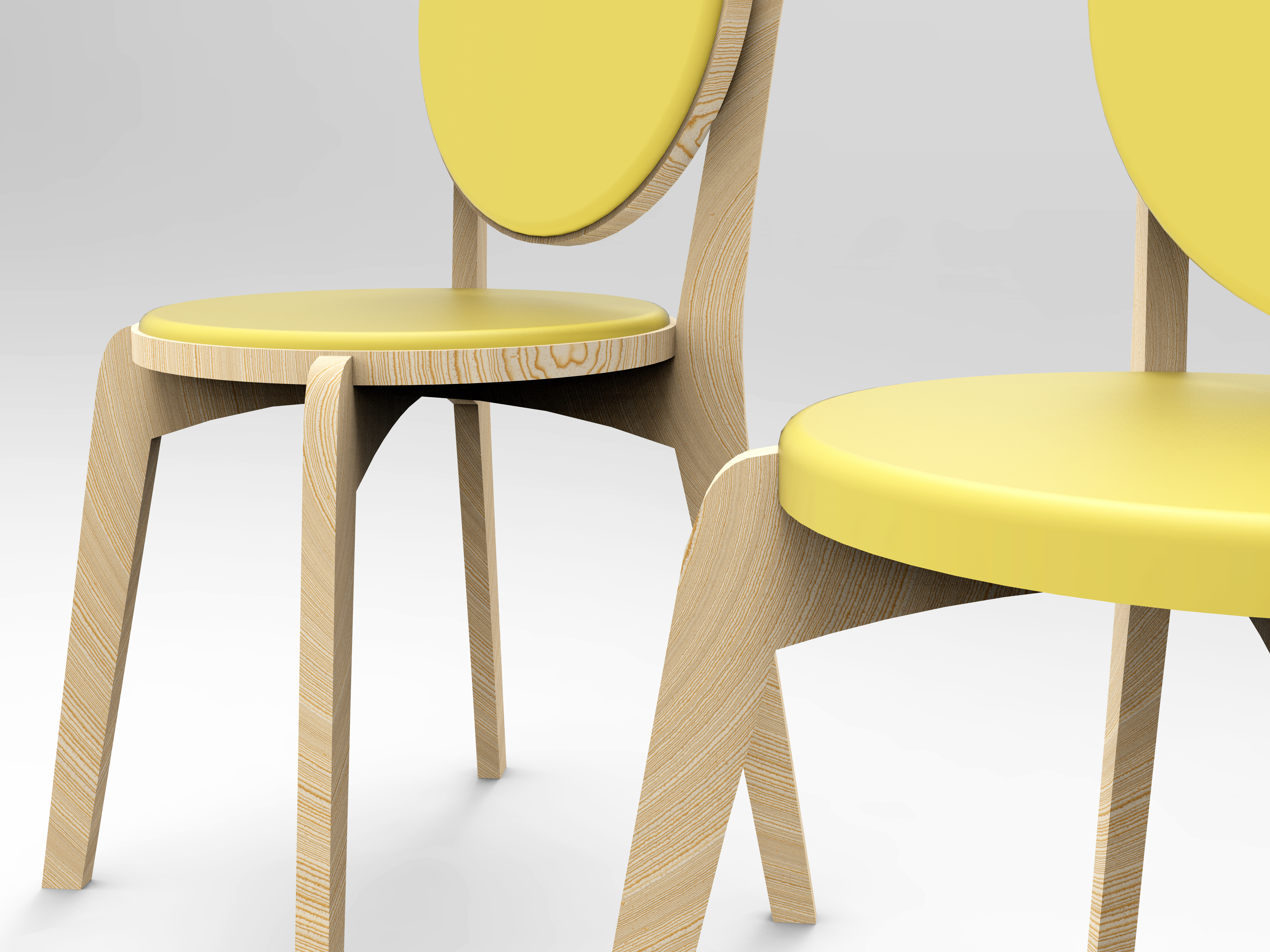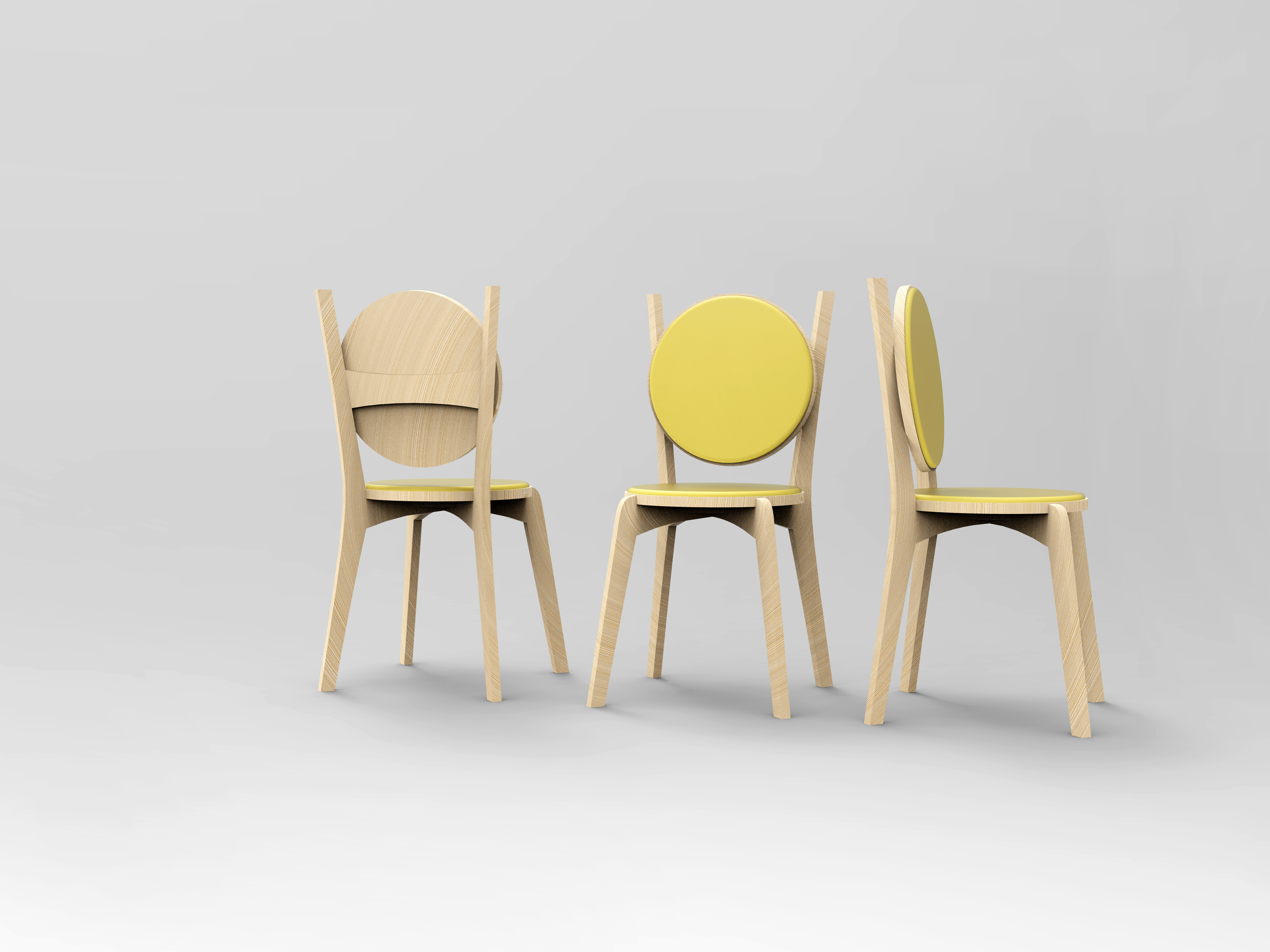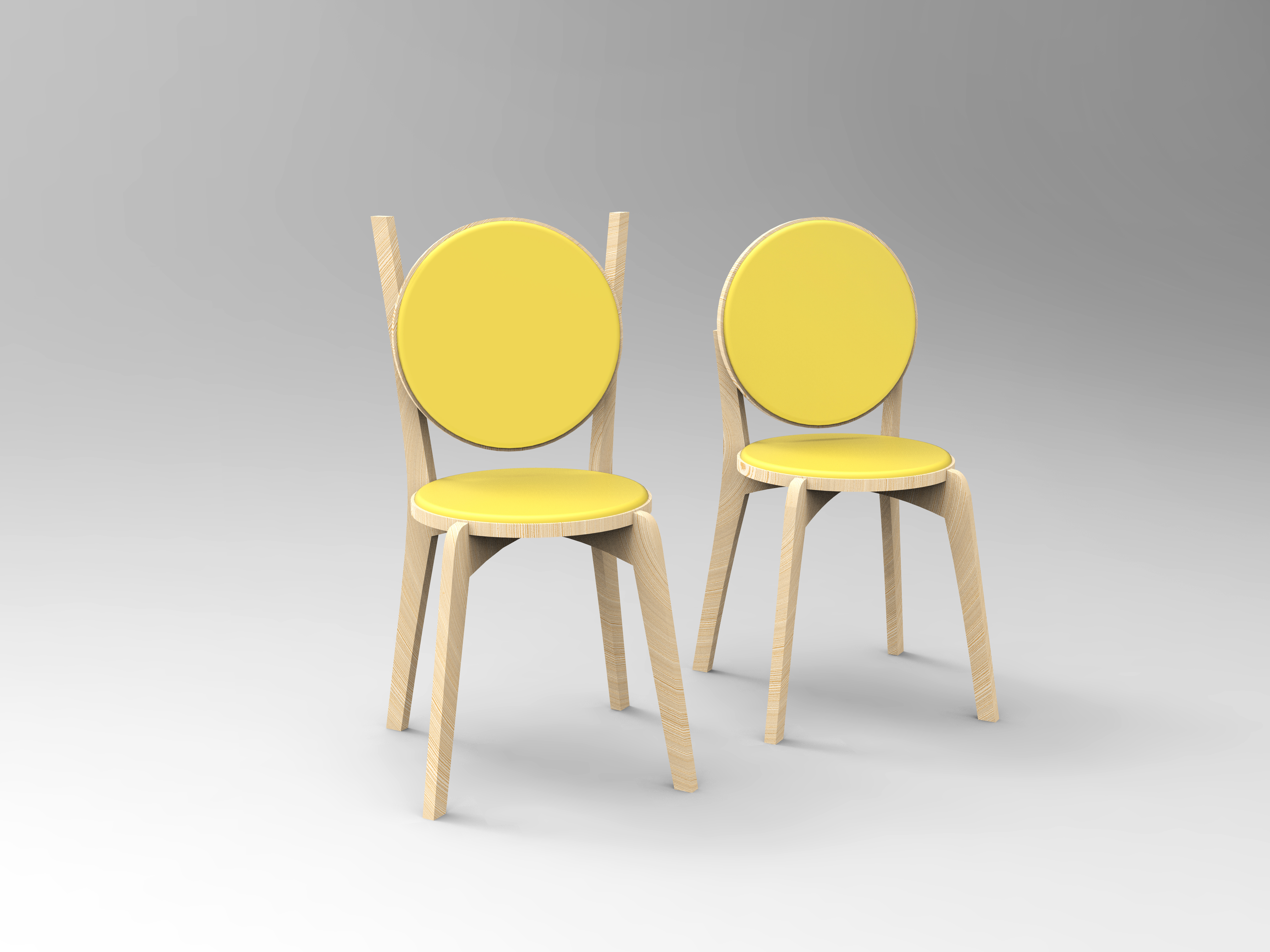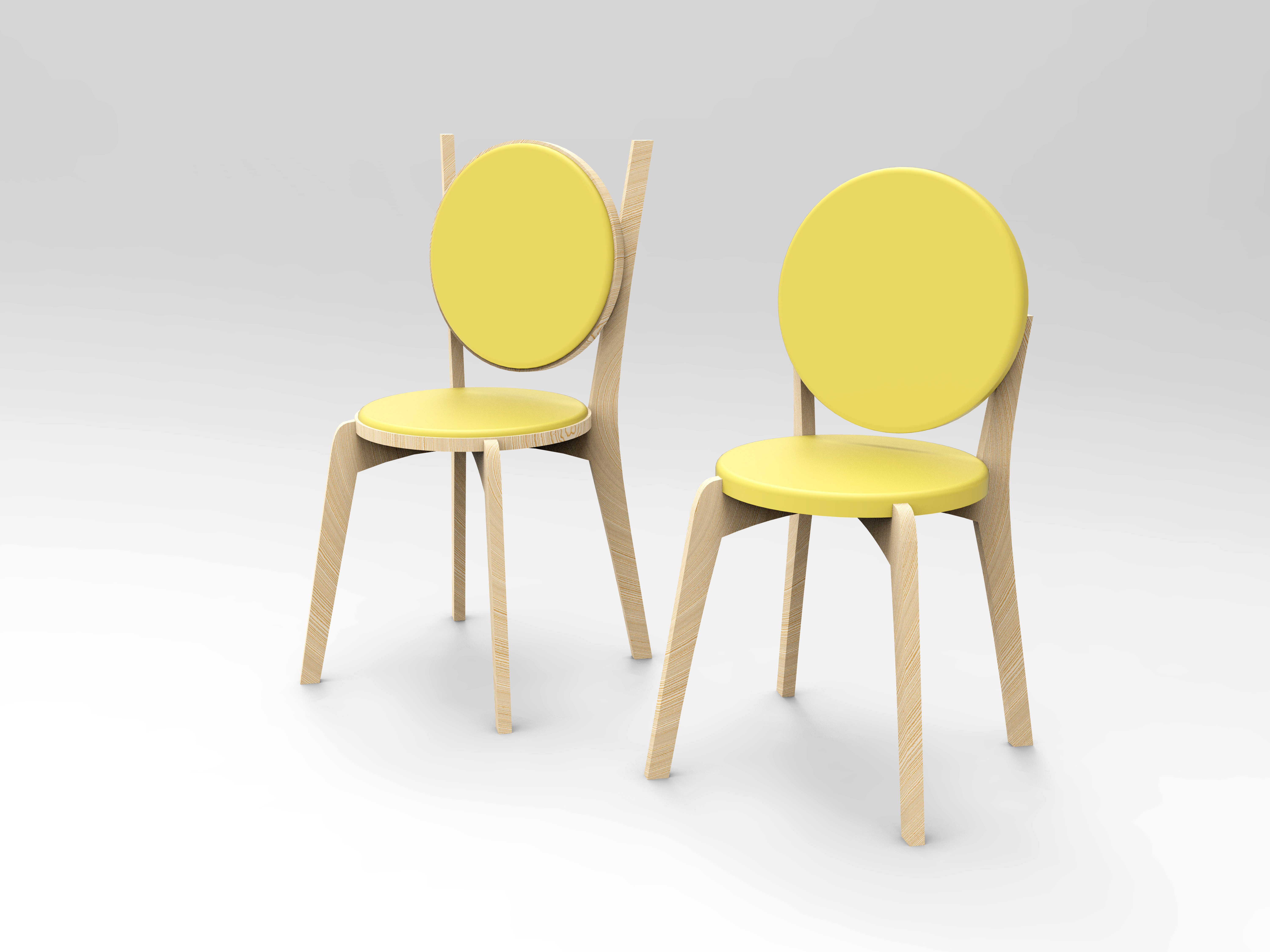 Zadáním bylo vytvořit židli podle technologických možností zadavatele. Židle se skládá z jednoduché konstrukce do kříže. Používám zde kulatý sedák a opěradlo. Díky konstrukci do kříže je židle dynamická a nabízí hned několik variant zpracování. Dalším výrazným prvkem je zde čalounění, které není přes okraj, nýbrž do kraje sedáku či opěradla.