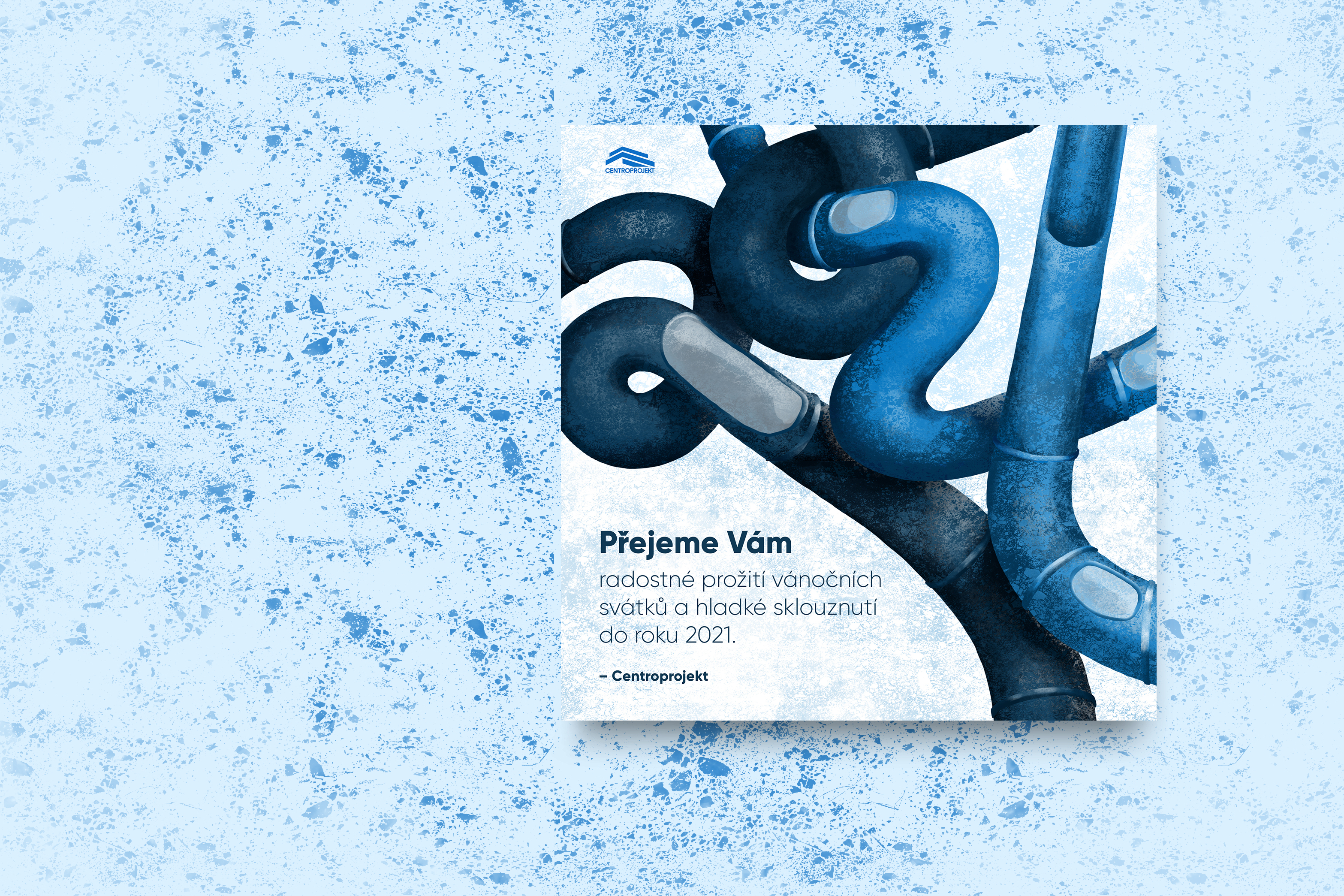 Přání k novému roku pro stavební firmu zabývající se především bazénovou technikou, které se točí stejně jako lidé na tobogánech. Digitální typoilustraci číslovky 2021, vyvedené jako zákruty vodních tobogánů, doplňuje vkusné jednoduché přání, významově si pohrávající s fokusem firmy. Primárně jsou použity barvy přímo z logomanuálu Centroprojektu.
