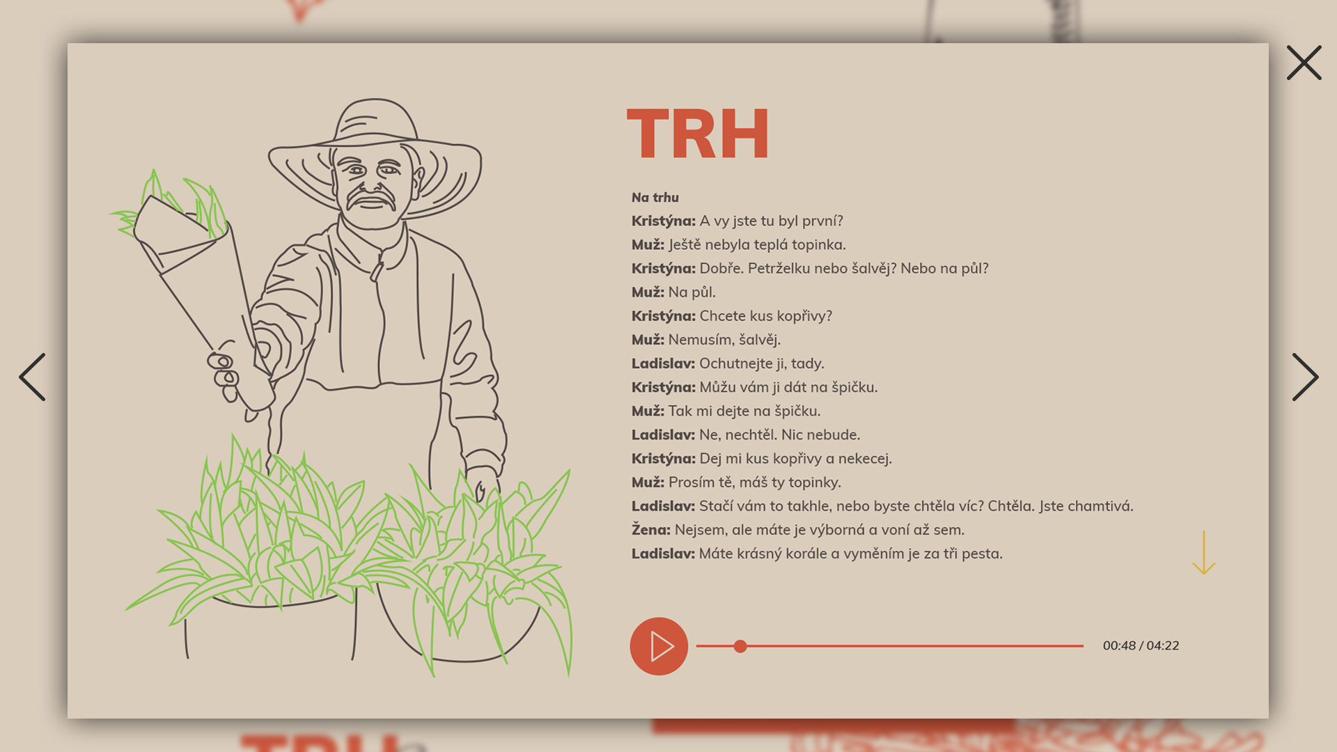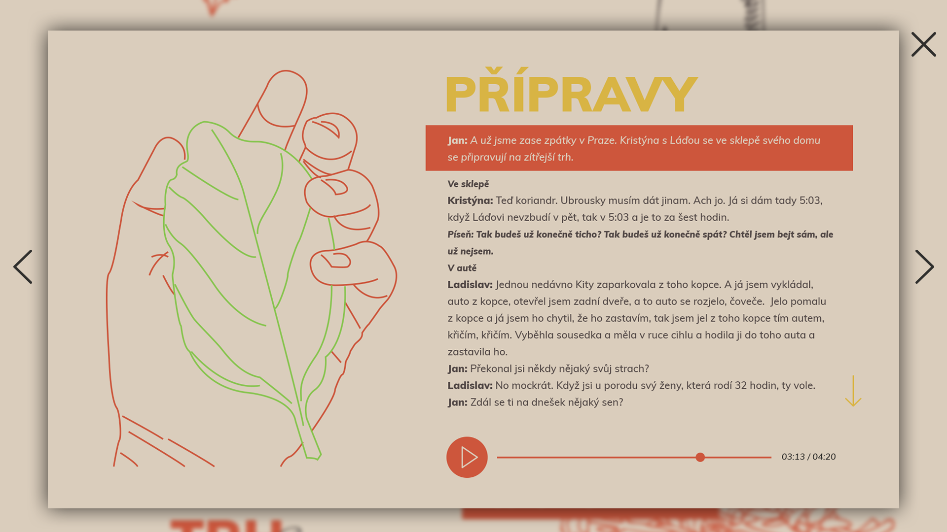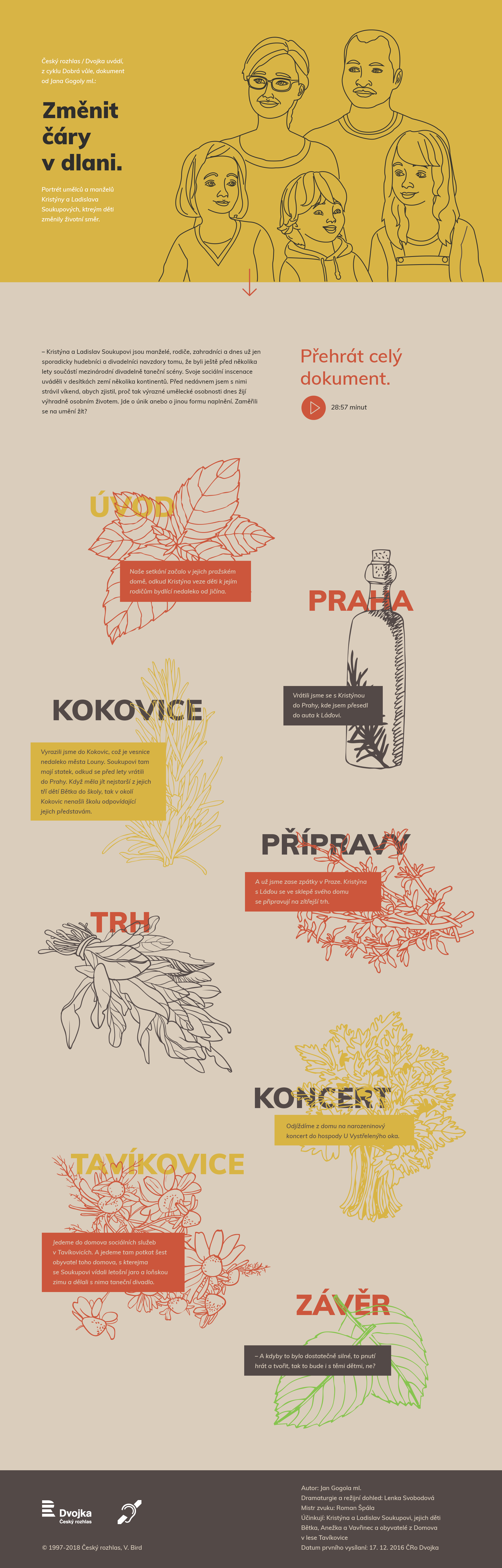 Návrh microsite pre Český rozhlas ako pomôcky pre nedoslýchavých. Interaktívny web ponúka možnosť prečítať si prepis dokumentu bez nutnosti zastavovať alebo vracať späť lineráne video /audio/. Nedoslýchavý má dostatok času prečítať si aj dlhšie texty a na ďalšiu "kapitolu" sa posunie sám. Pre uživateľov so zbytkami sluchu je možnosť pustenia prezentácie celej audio nahrávky s textom a ilustráciami, ktorá sa posúva samostatne. Web sa nesie v prírodných farbách a je doplnený o ilustrácie bylín a rodiny Soukupových.