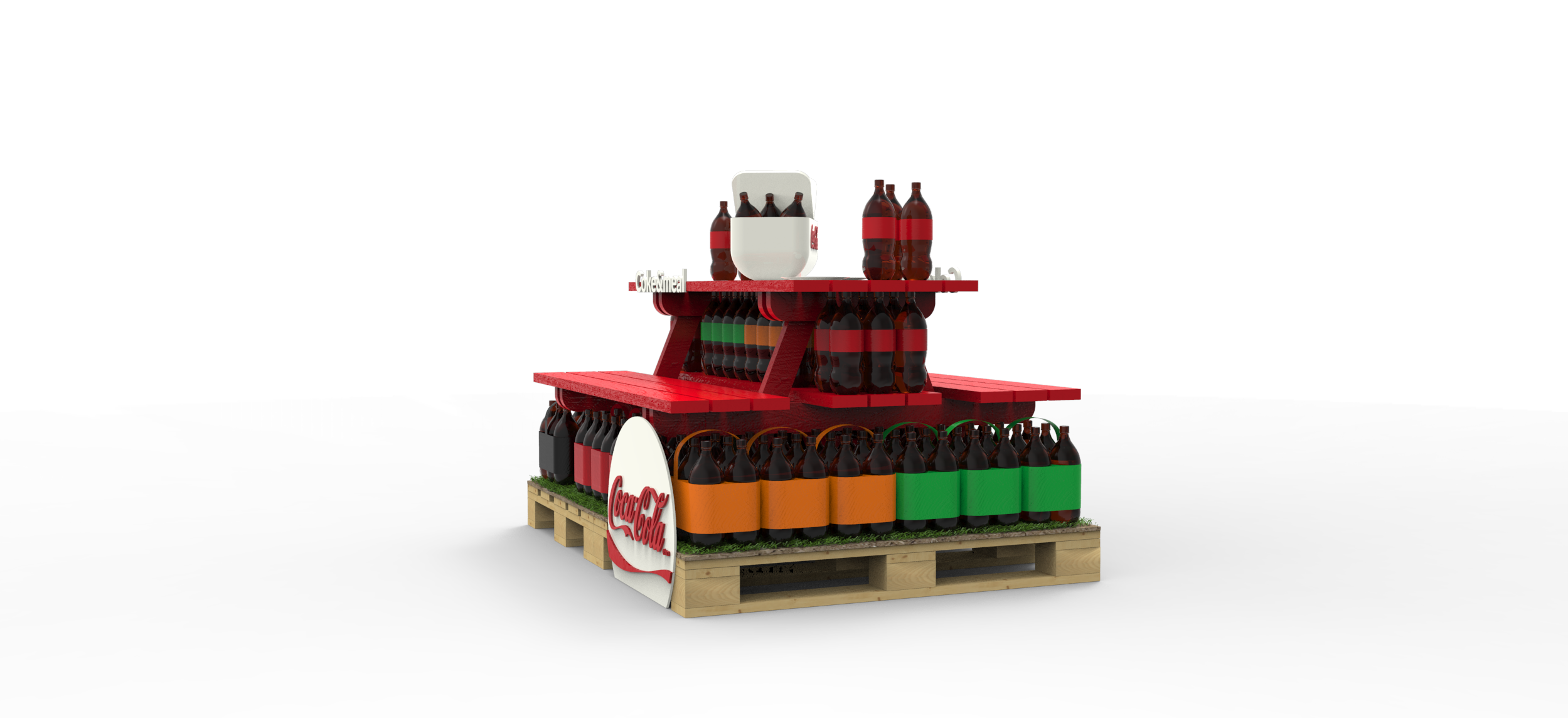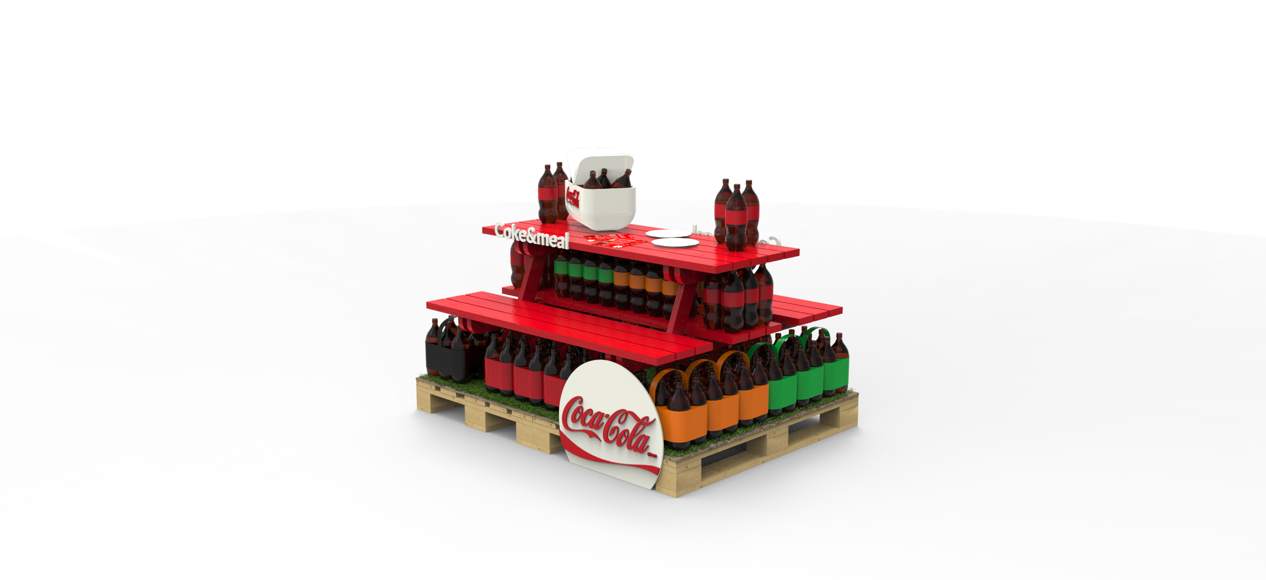 Hlavním vizuálním prvkem a zároveň prostorem pro vyskládání lahví je typická červená pikniková lavice. Na ní nechybí ani piknikový koš, ze kterého ční několik dalších lahví Coca-Cola. Stůl je v reálné velikosti, takže se na jeho lavice mohou zákazníci posadit a přečíst si například něco o kampani z letáků, které o ní budou informovat. Prostor uprostřed pod lavicí nabízí možnost uschování reproduktoru, který by mohl navazovat venkovní atmosféru a vzbuzovat například v zákazníkovi chuť po nápoji díky zvukům nalévající se Coca-Coly.