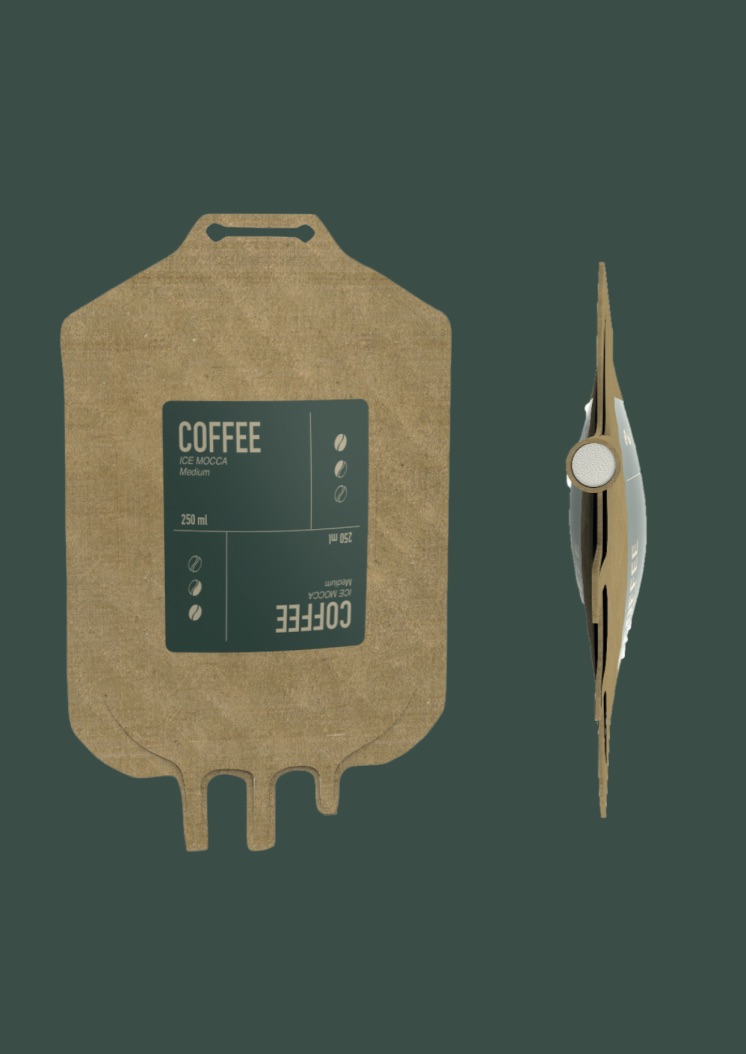 Produkt je navrhnutý ako obal na ľadovú kávu no má tvar sáčku na krv - Poukazuje na niečo bez čoho nedokážeme prežiť. Tam kde v medicíne dávaju infúzne hadičky
