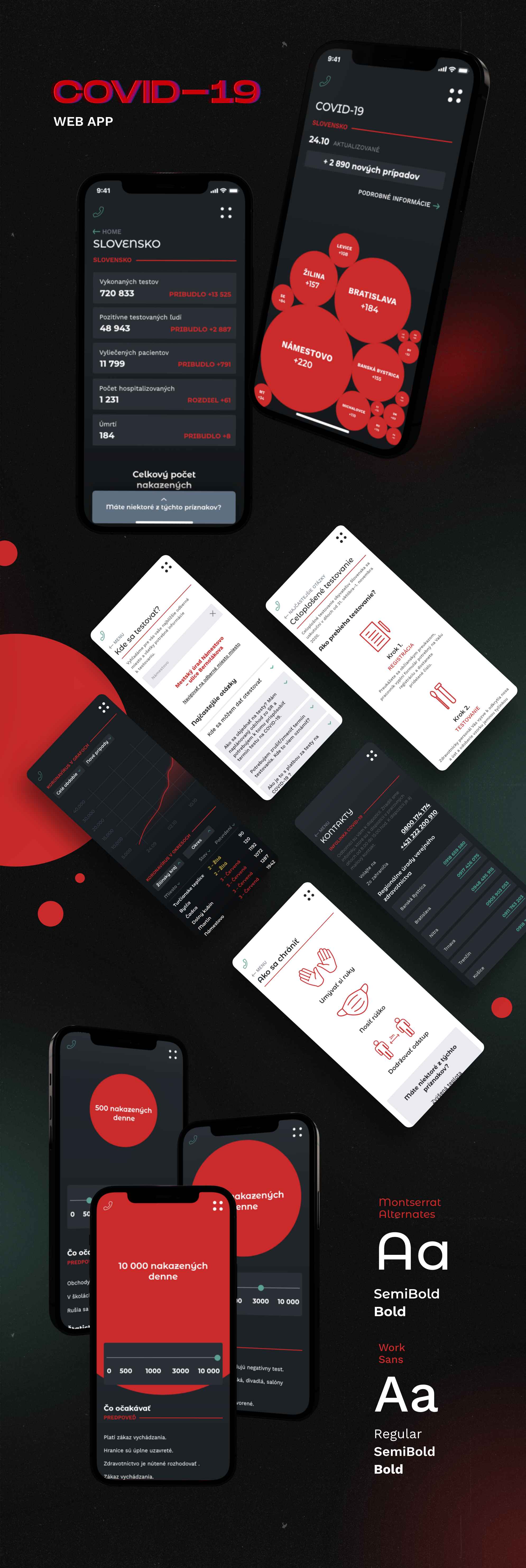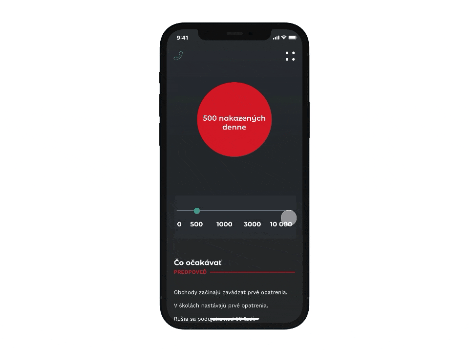 Cieľom mojej aplikácie bolo zhrnúť všetky základné správy ohľadom Covid-19 na jednom mieste. Aktuálne informácie bývajú často krát neprehľadné a mätúce, preto som vytvorila jednoduchý layout kde by sa užívateľ dostal k podstatným veciam rýchlo a jednoducho. V appke sa nachádza stav aktuálneho štátu, ale aj rýchle zhrnutie nových opatrení, kontaktov a nariadení. Aplikácia, ale nemá slúžiť len na informovanie, nachádza sa v nej aj možnosť "predpovede" kde užívateľ môže sledovať, ako sa by sa vyvíjal stav v rôznych počtoch infikovaných. Týmto spôsob aplikácia slúži ako taká "výstraha" toho čo môže nastať.