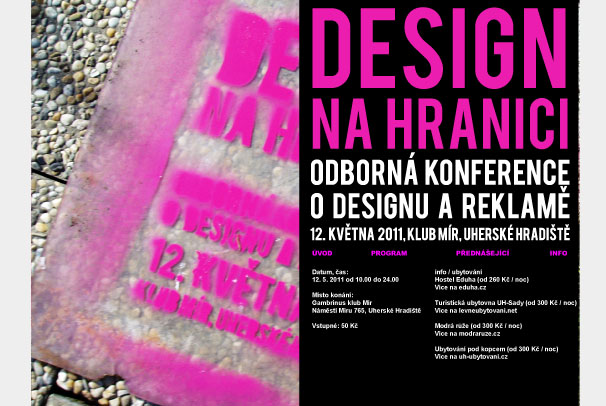 Vizuální styl pro konferenci o designu. Vše vzniklo sprejování přes šablony na určité venkovní plochy a následném vyfotografování a zpracování do vizuálního stylu. Práce má symbolizovat přechod mezi něčím konkrétním(nasprejovaný text) a nalezenými kousky všelijakých materiálů(střecha, dřevo, štěrk, polystyrén).