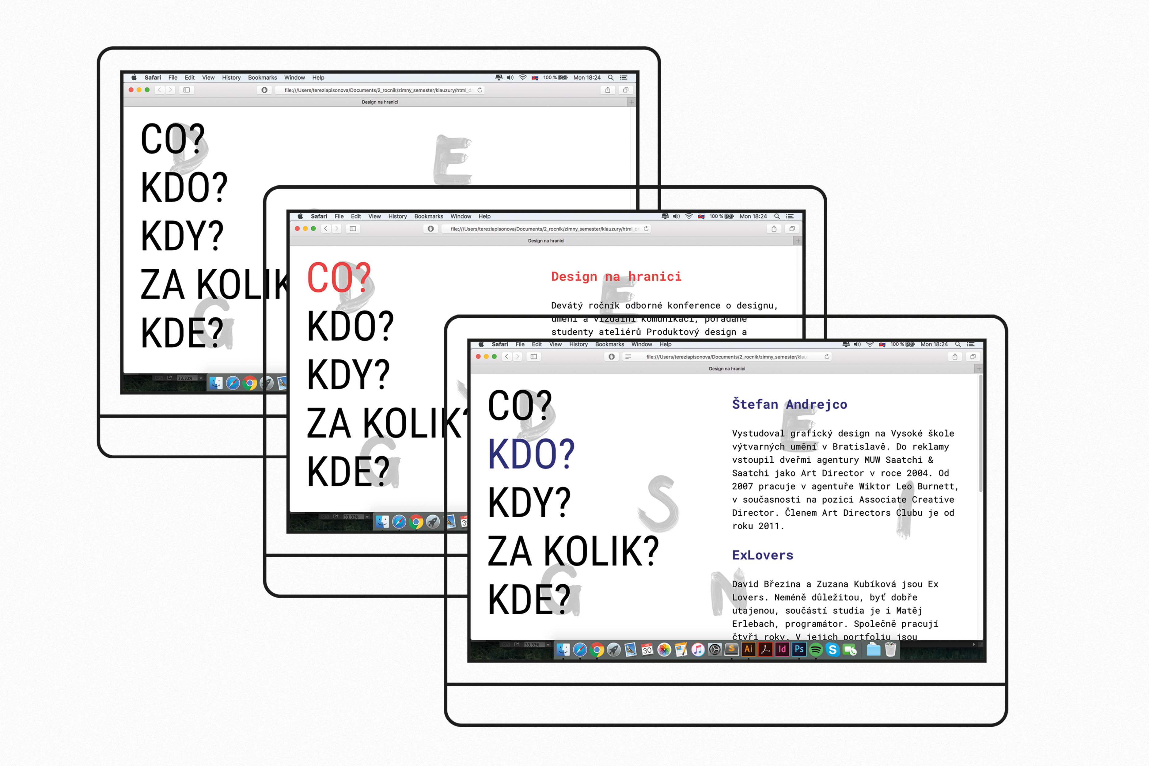 Visual style for proffesional conference Design na hranici (Design at the border). The number 9 was main element for my work. 9th year, 49/99 crowns for entry. The change from 9 to "G" is like a process of designing. In the beggining of designing you never know what it will looks like in the end. The unconventional composition of the poster support the idea of the "G to 9 process" and the idea of dividing the word "hranici" (border). The webpage is very simple and because it's web for event, I asked main question you need to know when you want to visit some of the events (What? Who? When? How much? Where?) with simple answers for questions.