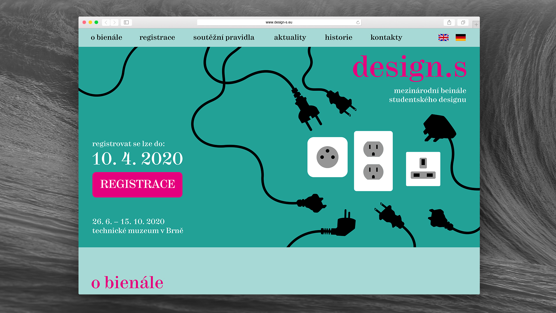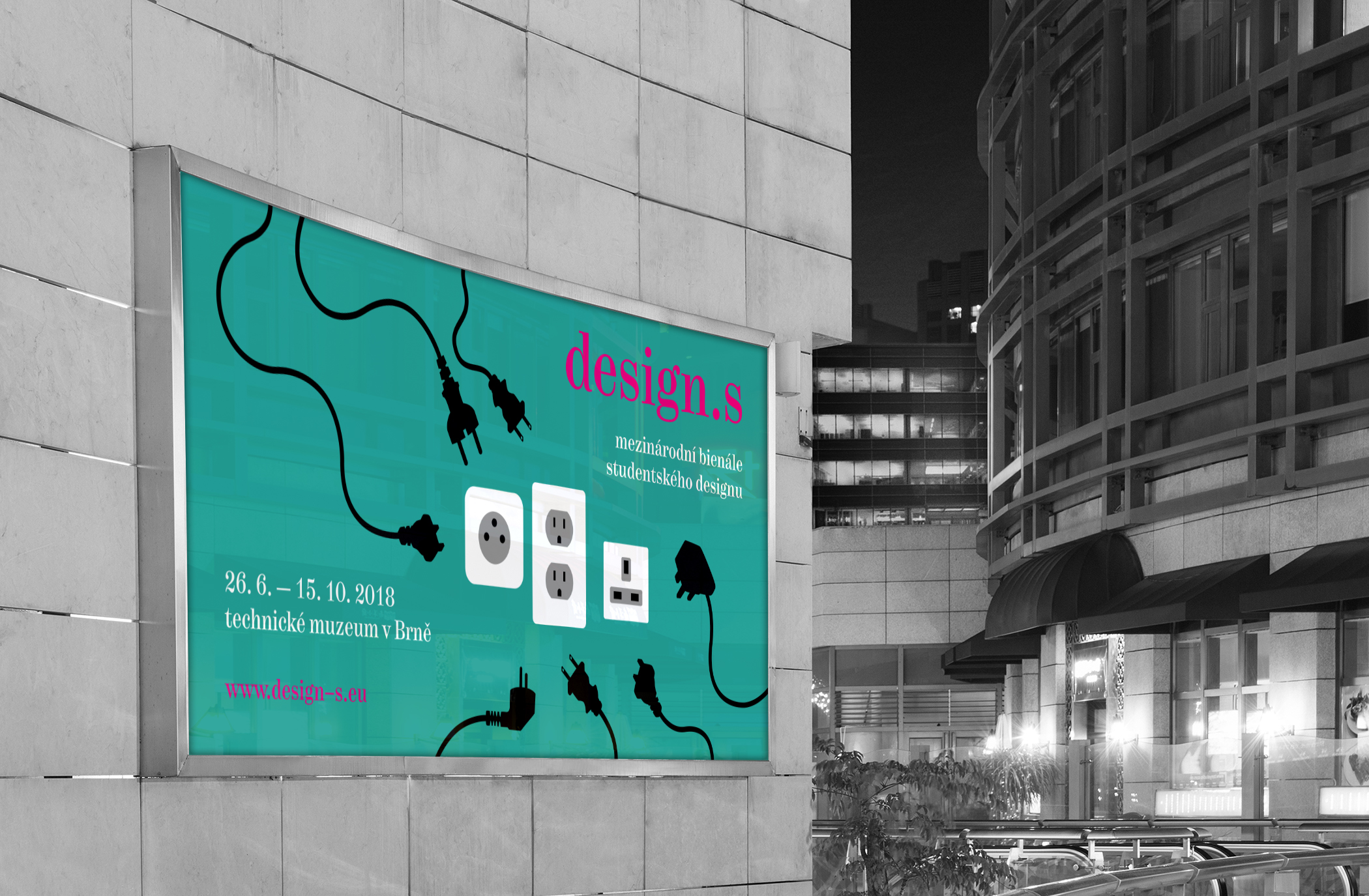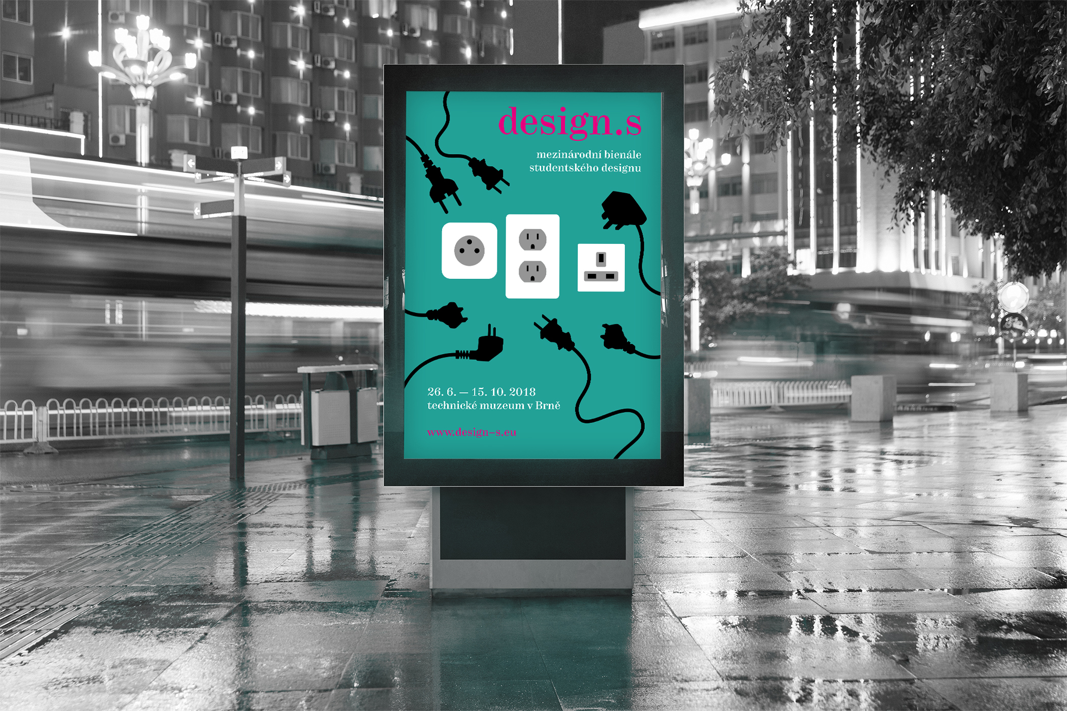 Návrh vizuálního stylu Design.s - brněnského bienále mezinárodního studentského designu. Zadání jsem pojal s trochou nadsázky a zobrazil studentský boj o elektrické zásuvky. Studenti designu jsou mobilní a většinou přenášejí své počítače a další vybavení na různá místa - mohou tak pracovat nejen v ateliéru, ale i na koleji, také na dlouhých přednáškách, v knihovně, doma, v kavárně a prostě kdekoliv, kde je elektrická zásuvka. Design je tedy závislý na počítačích a počítače jsou závislé na zásuvkách. Zobrazený motiv lze také chápat tak, že do soutěže Design.s se přihlásí více uchazečů než kolik jich skutečně svou práci vystaví (v případě zásuvky se ne na každého dostane - kabelů v mém pojetí je záměrně více než kolik je zásuvek). A jelikož je přehlídka mezinárodní, jsou mezinárodní i zásuvky.