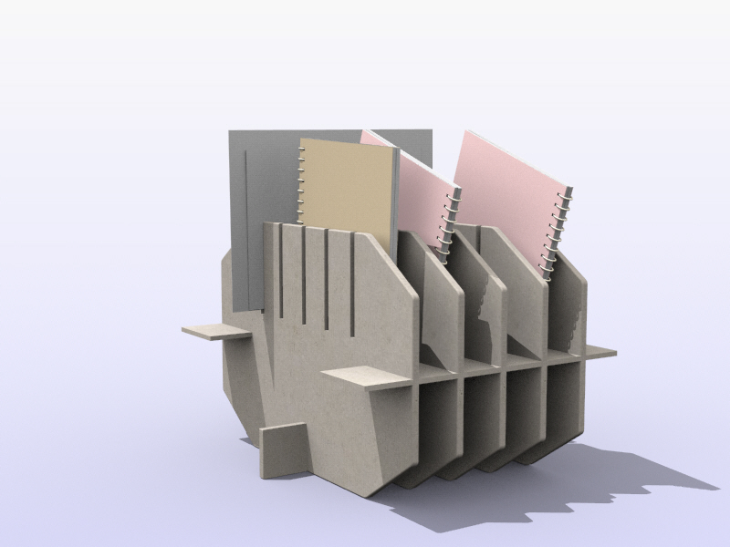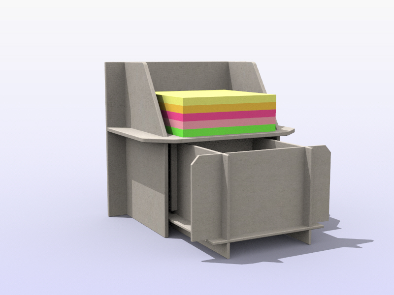 Sada troch doplnkov na pracovný stôl je vyhotovená z knižnej lepenky (recyklovaný materiál) o hrúbke 2 a 3 mm. Doplnky sú poskladané z plošných dielov, ktoré do seba zapadajú pomocou zárezov v dieloch. Všetko drží bez použitia lepidla a dá sa jednoducho rozložiť a opätovne zložiť.