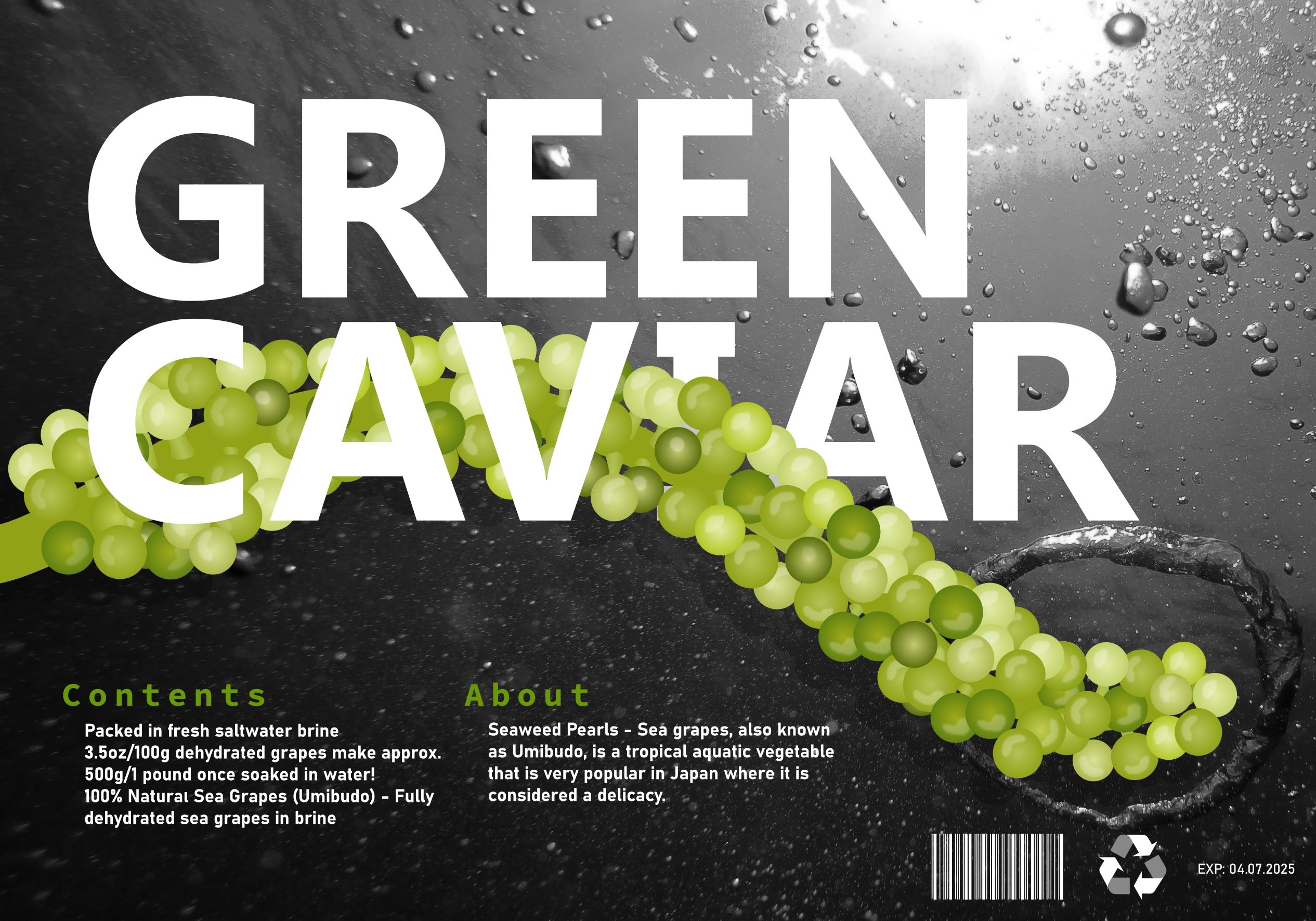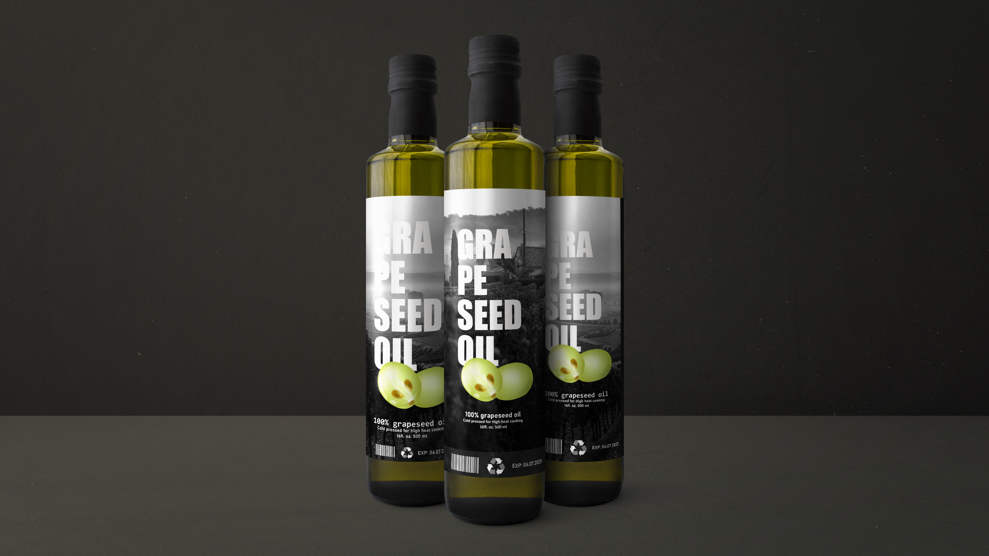 Design obalu konzumného oleja z hroznových semiačok a zeleného kaviáru.