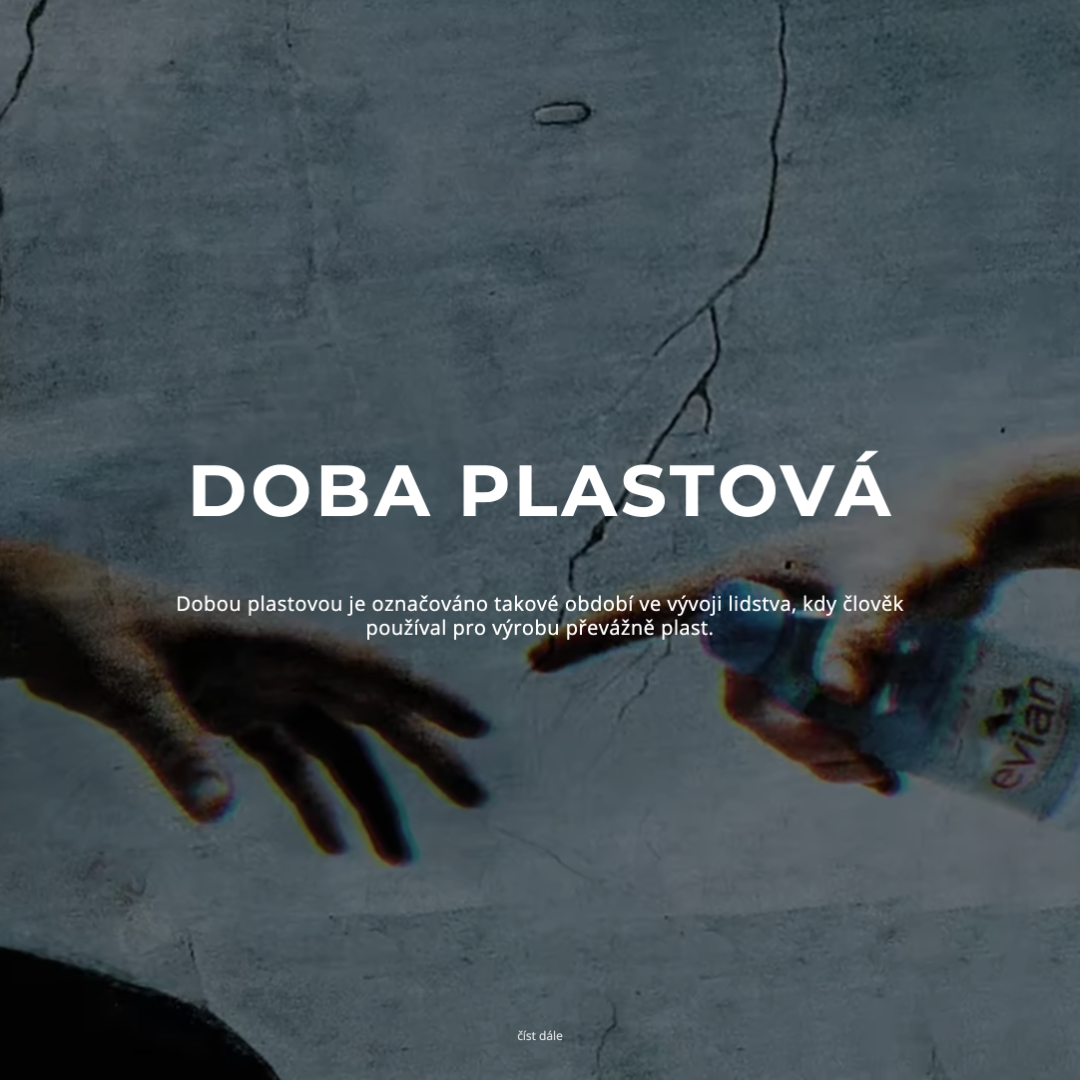 Doba plastová přestavuje microsite upozorňující na nadměrné používání plastů. Konkrétně se jedná o návrh UI/UX. Microsite je plně responzivní a k veškerým informacím jsou poskytnuty odkazy na původní zdroje. Informační strategie nejdříve poukazuje na problémy skrze čísla, multimédia a interaktivní obsah. Ke konci webu je uživatelům zobrazeno několik možných kroků, jak plastovému šílenství zabránit.