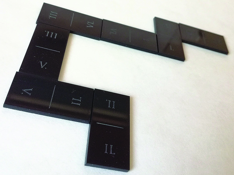 Rozhodla som sa vytvoriť domino, kde som použila rímske číslice a klasické čísla namiesto klasických bodiek. Domino je vylaserované do plexiskla. Vyrobila som dva druhy, prvé je čierne domino s rímskymi číslicami a druhé je ,, zrkadlové,, domino s klasickými číslami. Dominá sú malej veľkosti takže sú ľahko prenosné a nezaberajú veľa miesta a v kombinácií s použitým materiálom pôsobia mierne luxusne a hráča zaujmú na pohľad.