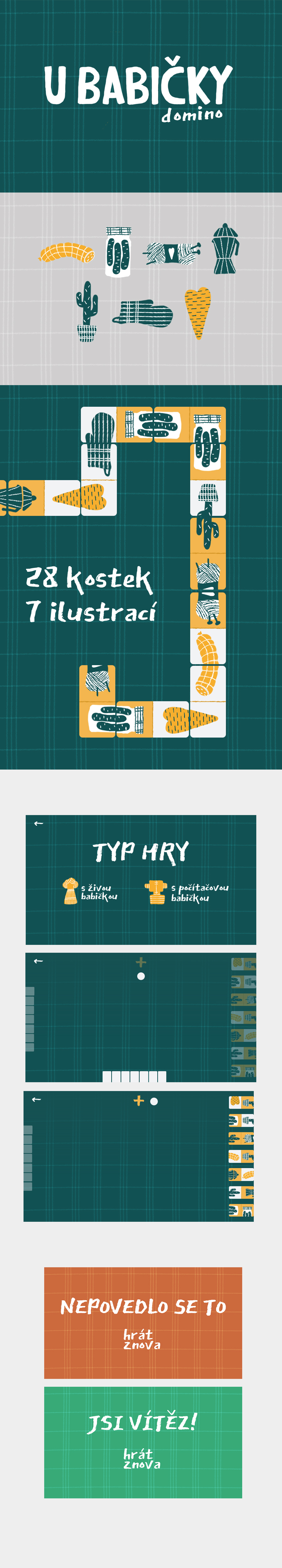 Desková hra domino provedená v digitálním rozhraní. Pravidla vychází z klasické hry - 7 znaků, 28 kostek, každá dvojice se vyskytuje v balíčku jen jednou. Vizuální zpracování je inspirované prvky z návštěvy u babičky.