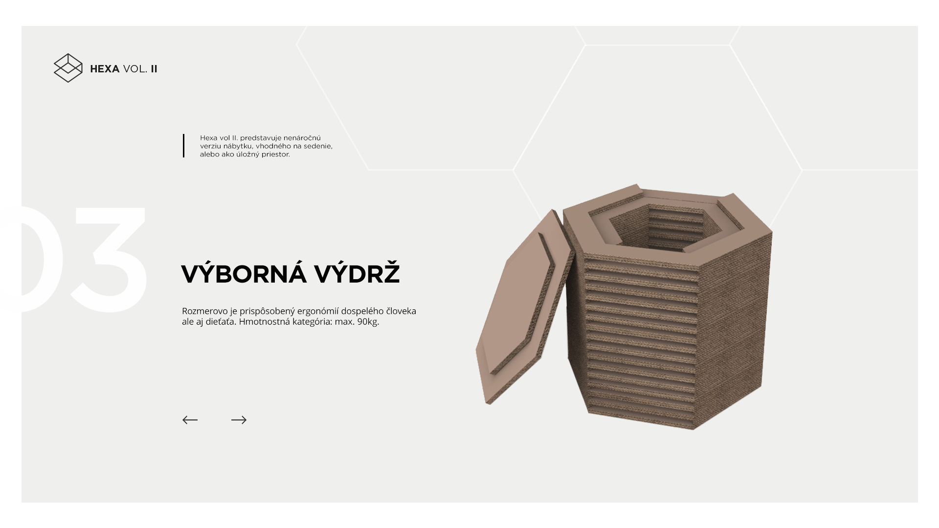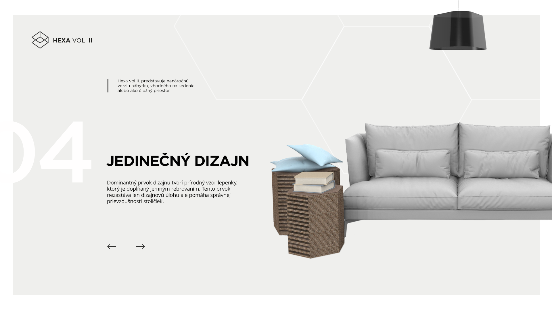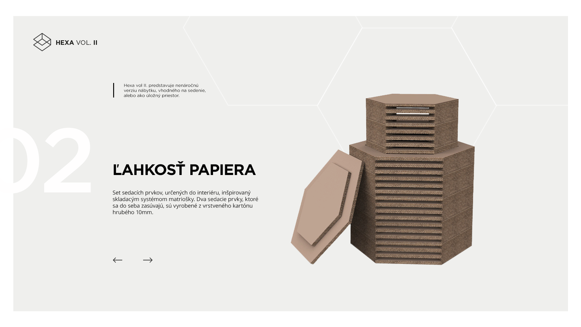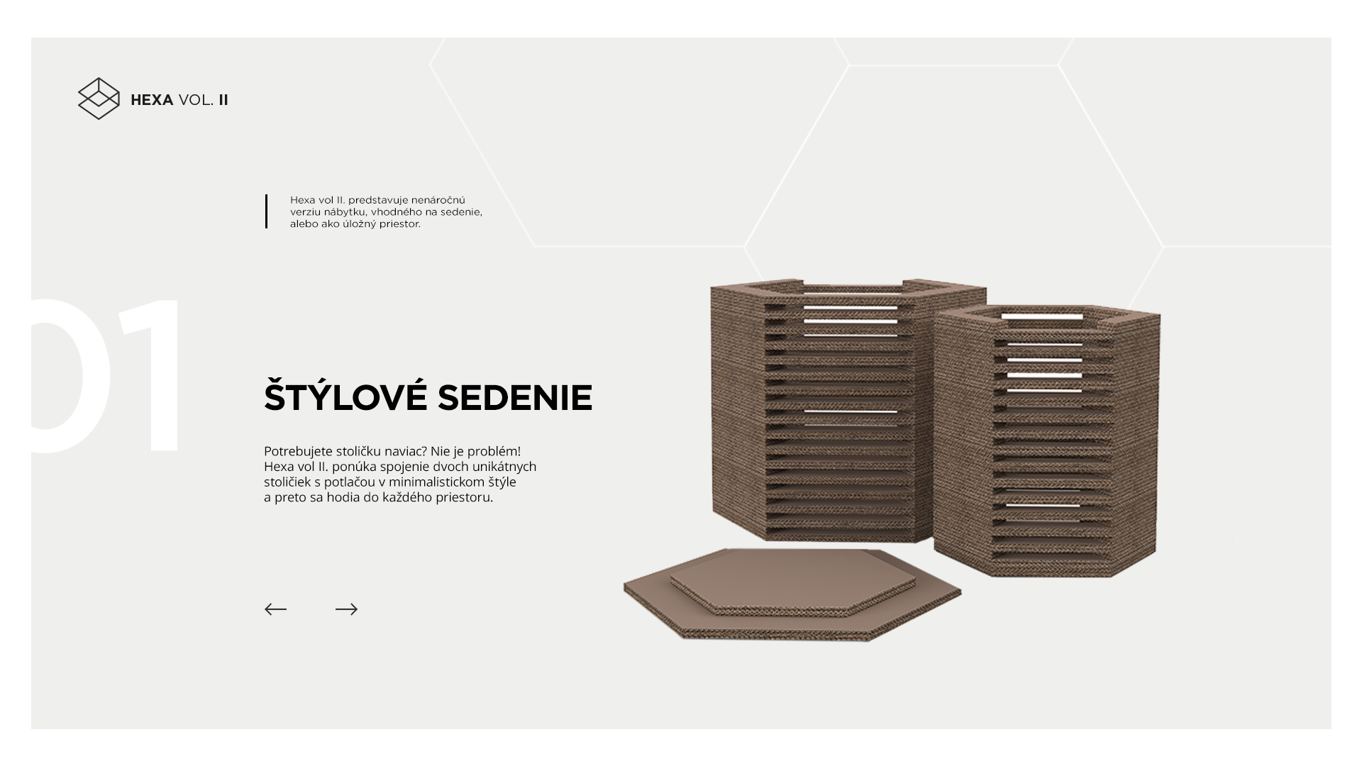Vizuálny štýl prezentácie pre papierový nábytok Double Hexa v minimalistickom štýle. Logotyp predstavuje spojenie hexagónu a dvoch častí nábytku, zatiaľ, čo tenké línie vytvárajú dojem papiera. Minimalistický štýl sa prenáša ako do potlače sedacej časti stoličiek, tak i do výslednej slideshow microsite.