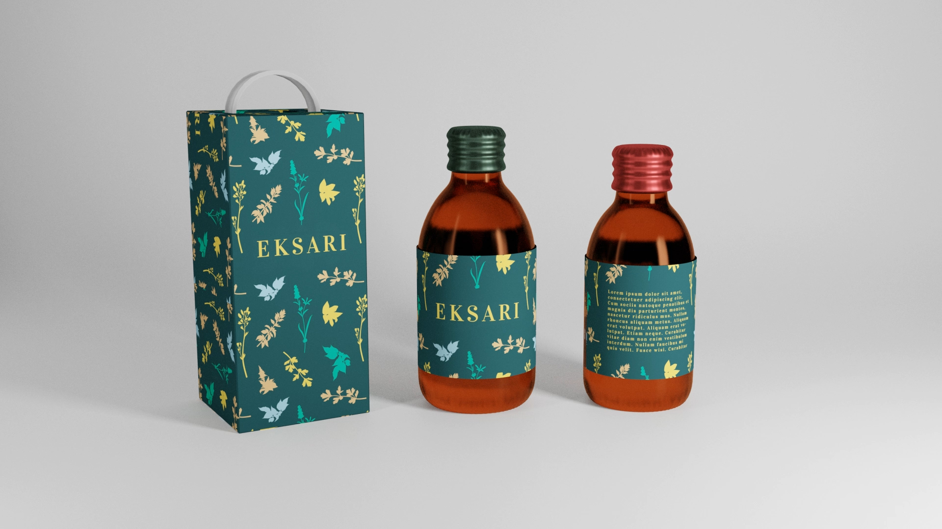 Vizuální styl Eksari je inspirován prostředím tajgy. Hlavní motiv se skládá z textury stylizovaných bylin různých druhů. Barevnost vychází z estetiky bylin a barevnosti víček lahví. Zvolil jsem serifové písmo, protože se tvarově doplňuje s florálním motivem.