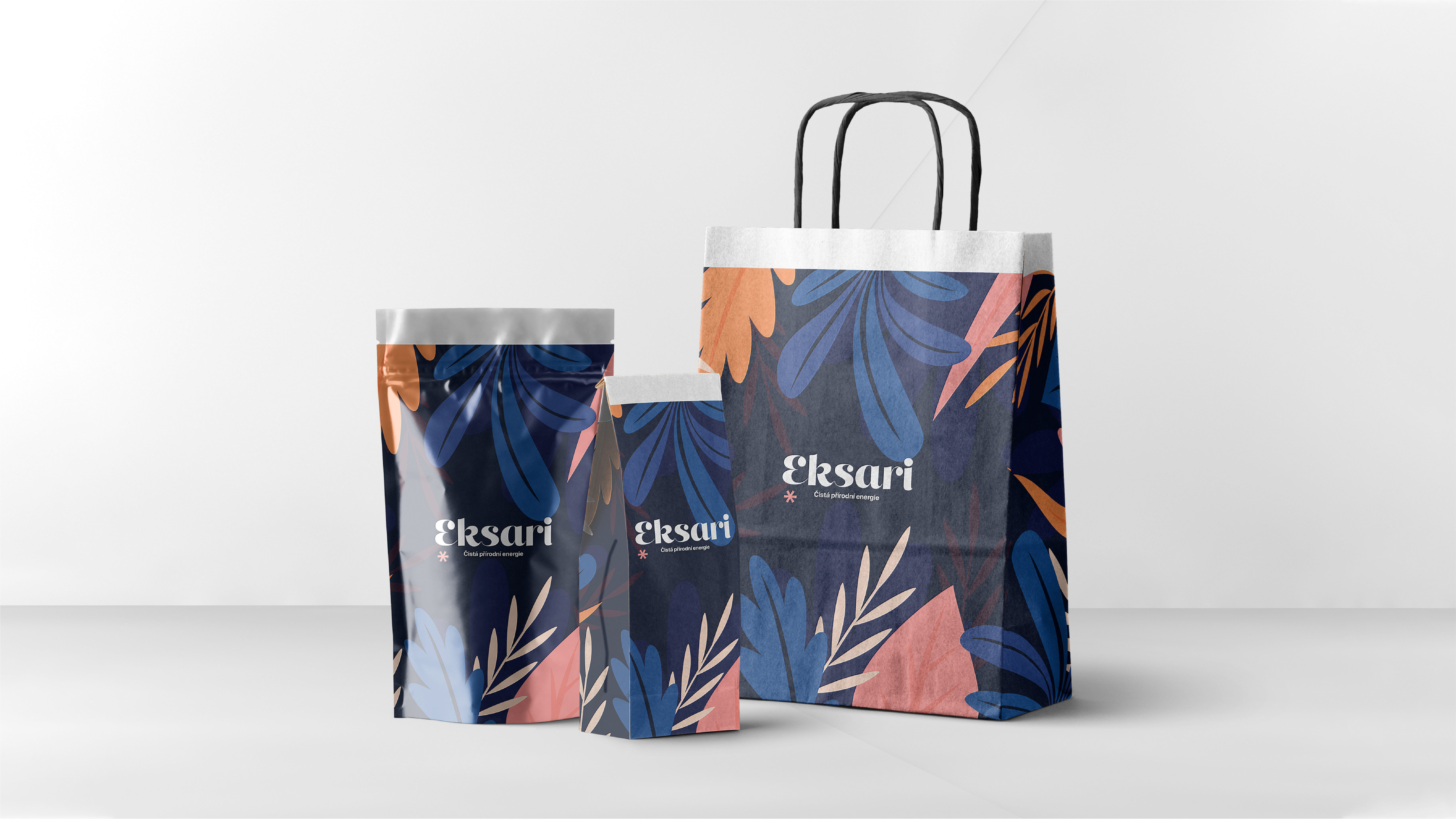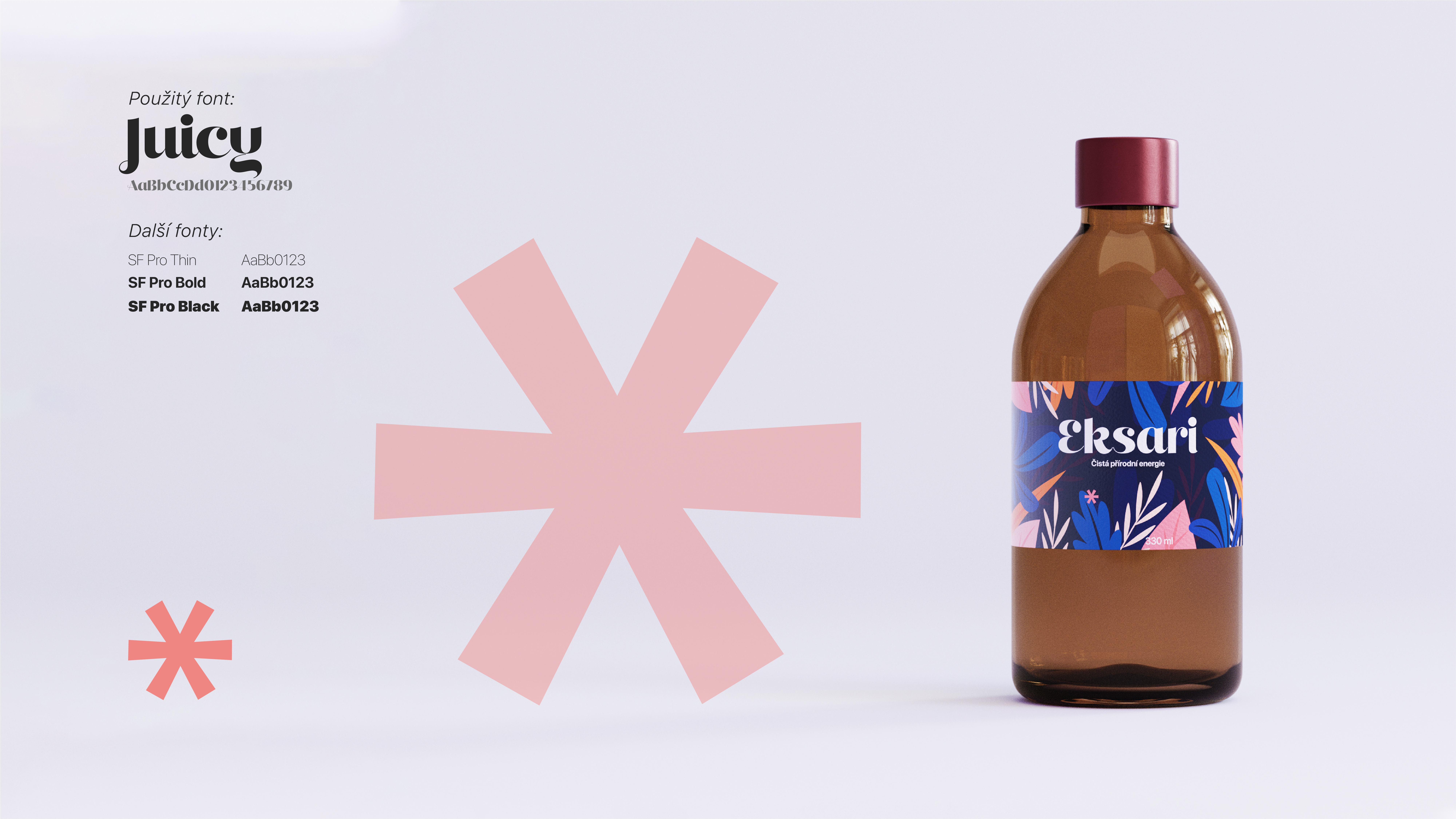 Eksari je potravinový doplněk z extraktu bylin, vycházející z receptury sibiřských Evenků. Já jsem tento projekt pojal spíše více stylizovaně, grafika je vytvořená z jednoduchých tvarů listů a bylin. Barevnost je spíše z chladnějších barev a semtam se někde objevuje teplejší barva. Logo je velice jednoduché, složené jen z nápisu, podnadpisu a typografické hvězdičky (ta je jen ozdobný prvek).