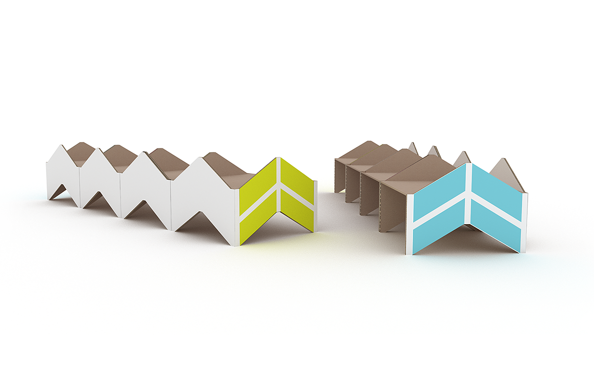 Nábytek pro děti složený ze čtyř stejných prvků, které do sebe zapadají. Otáčením a skládáním vznikají různé kombinace - lavice, úložný regál nebo stůl se stoličkou.