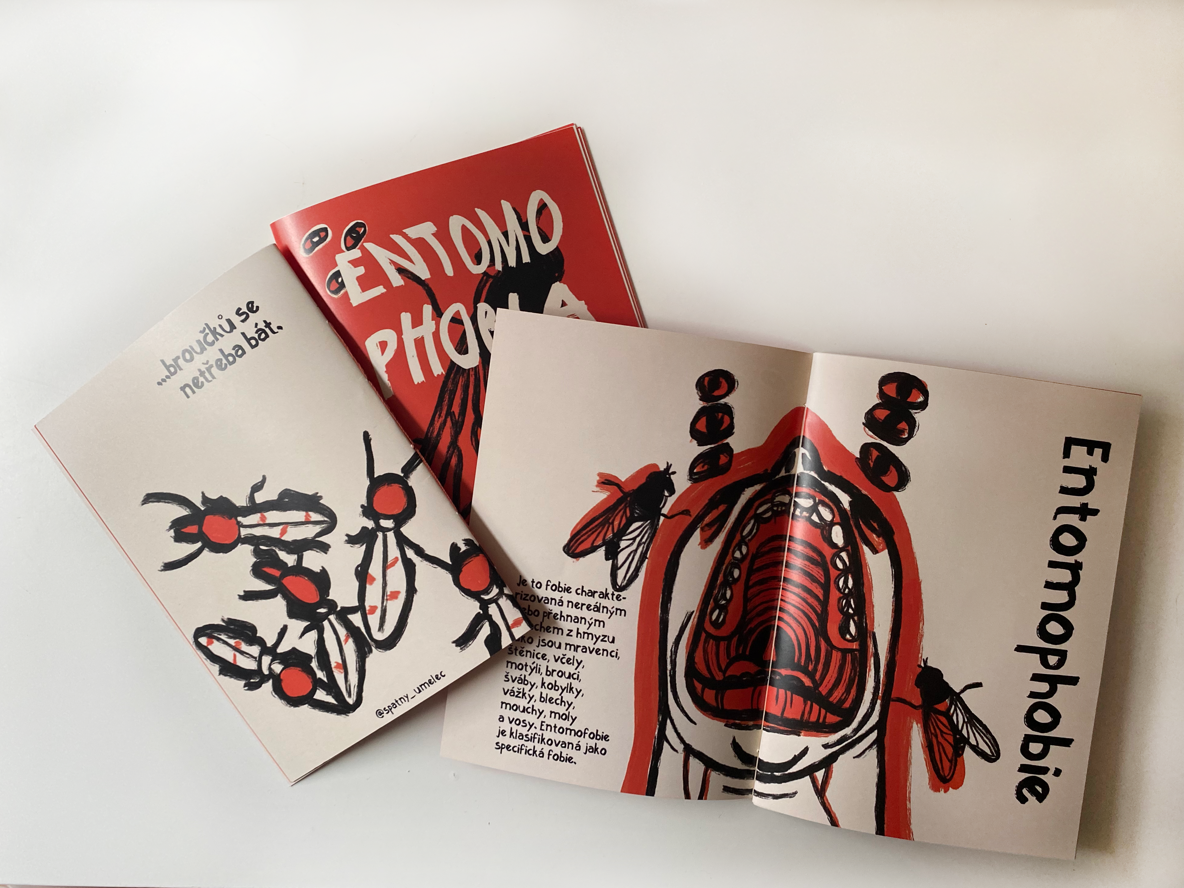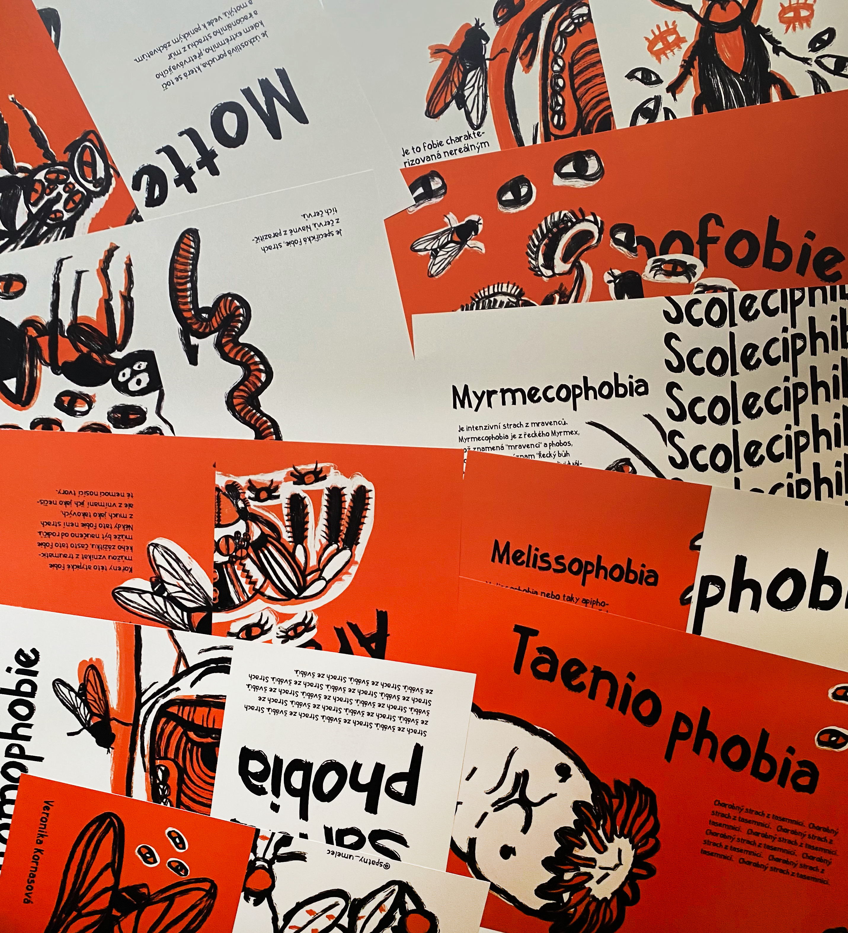 Entomophobia je školní cvičení, kde jsem si hrála s typografií, vytvořila jsem si ke svému stylu ilustrací font, který jsem použila do sazby.