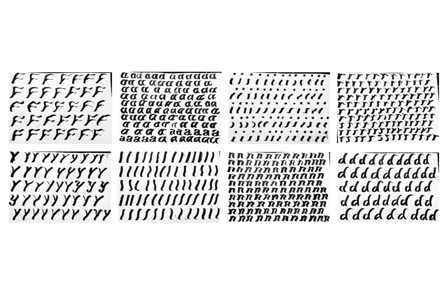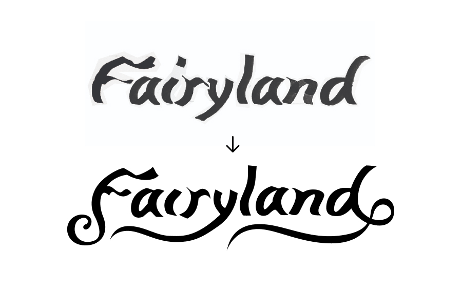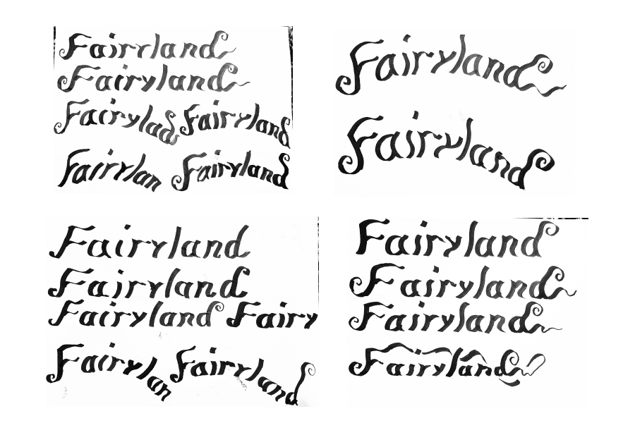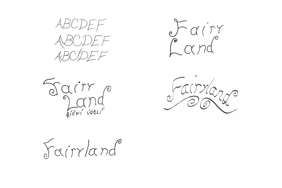 Kaligrafický nápis Fairyland je vyústěním několika kresebných cvičení a experimentů. Nejdříve jsem skicoval různá písmena tak, aby jako celek působila organicky. Poté jsem začal zkoušet aplikovat tvarosloví konkrétně na nápis Fairyland. V průběhu skicování jsem vytvořil experimentální kaligrafické pero, díky kterému písmena získala větší dynamiku. Finální variantu nápisu jsem převedl do křivek a rozpohyboval.