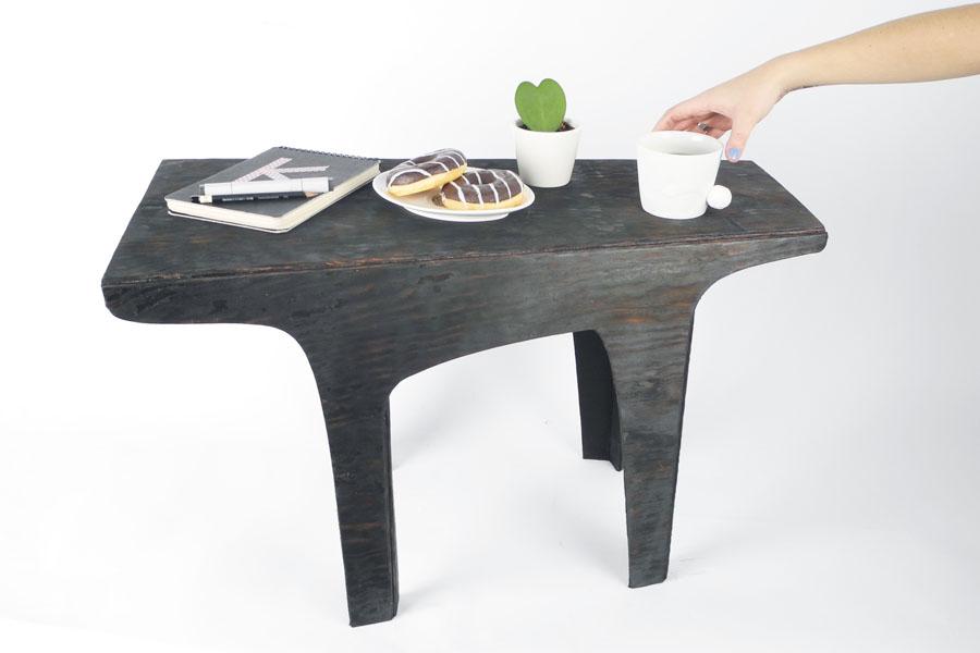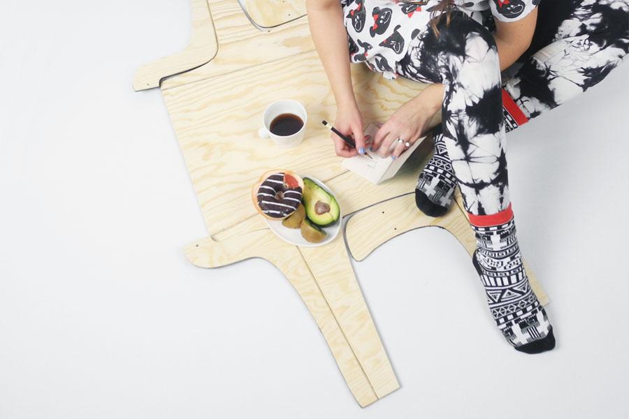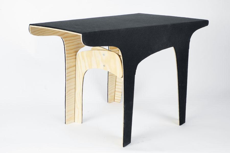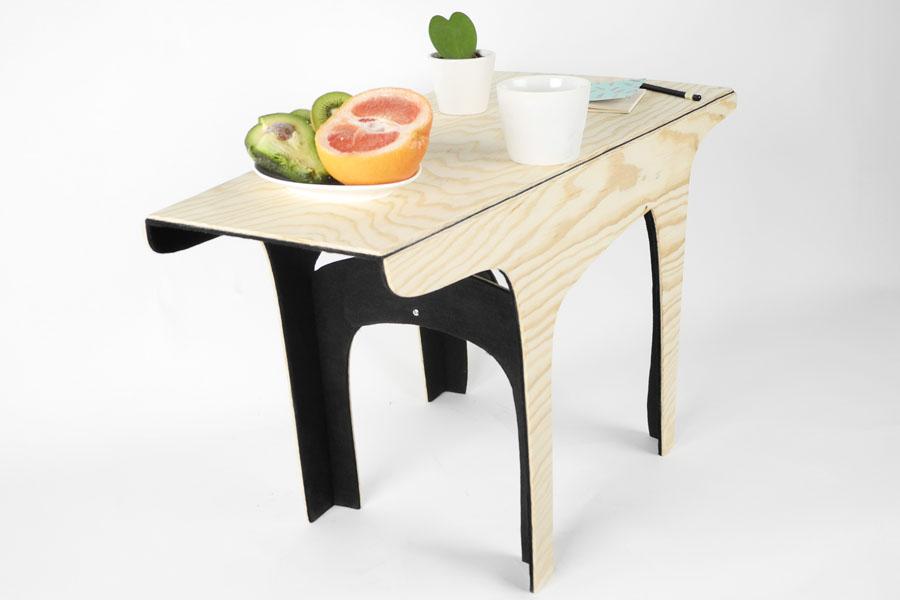 Lehký funkční stolek který lze převrátit naruby a používat jej jak dřevěný tak plstěný a v rozloženém stavu jej lze využít jako podložku na zem.