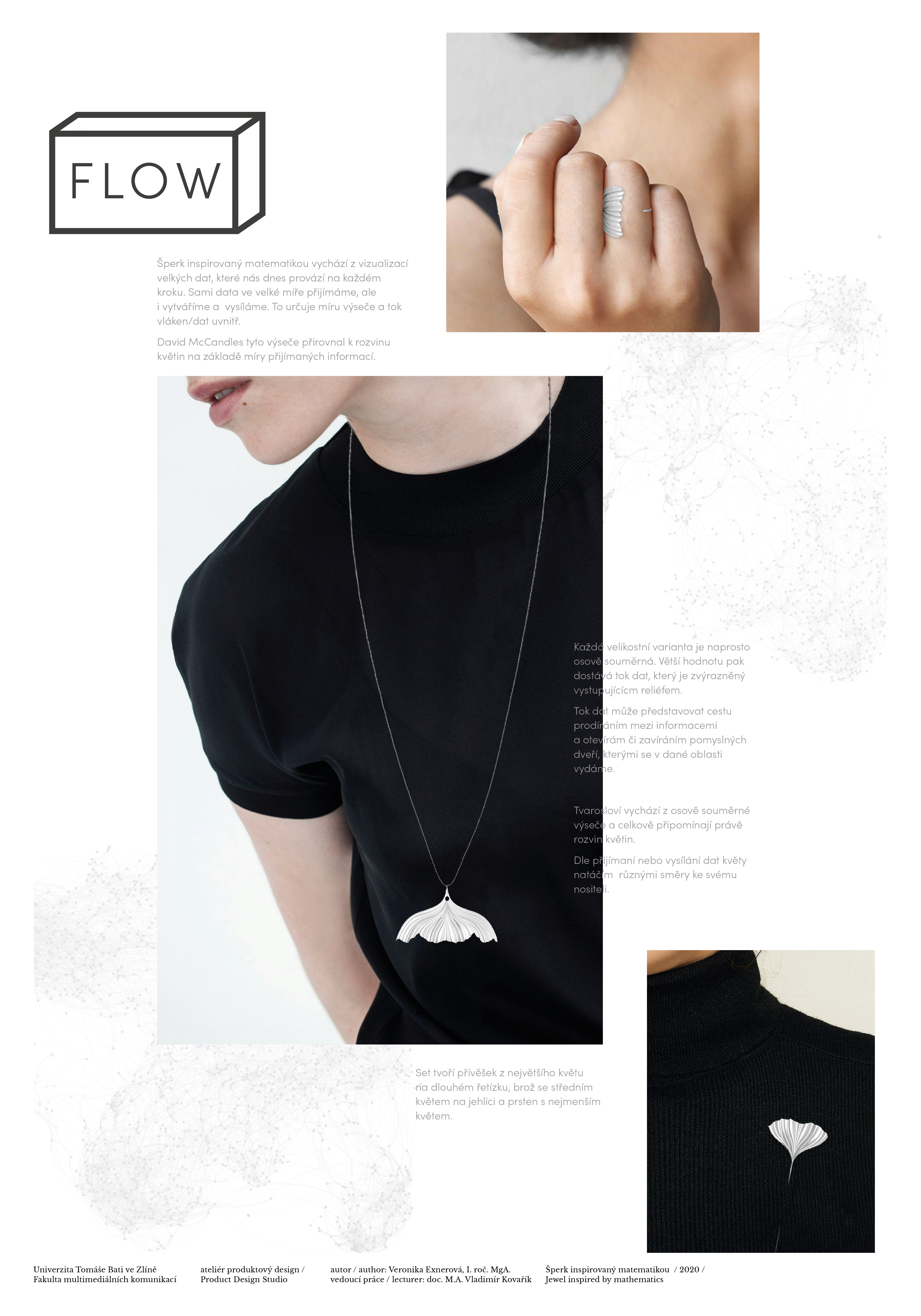 Šperky inspirované matematikou vychází z vizualizací velkých dat, které nás dnes provází na každém kroku. Sami data ve velké míře přijímáme, ale i vytváříme a vysíláme. To určuje míru výseče a tok vláken/dat uvnitř.