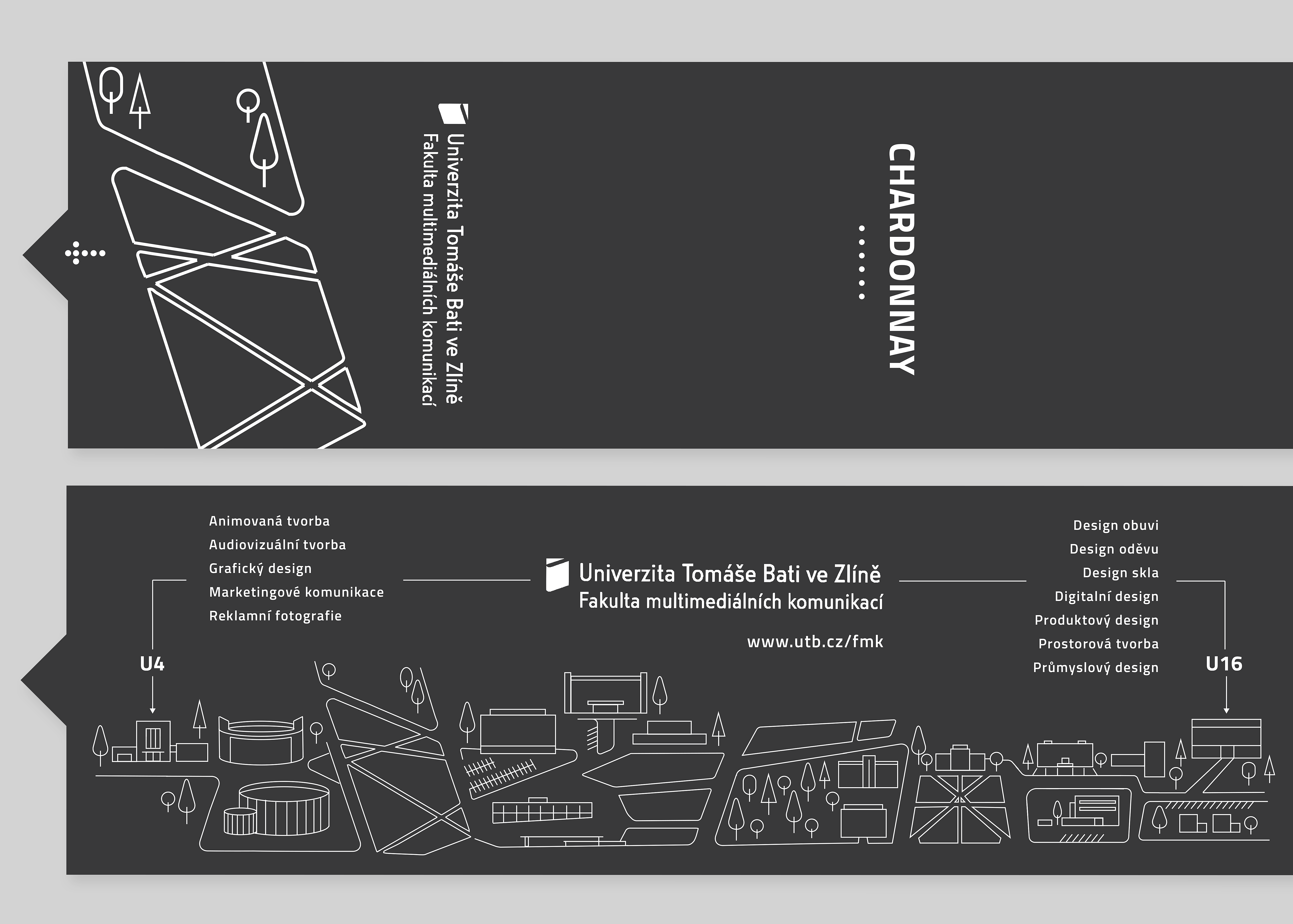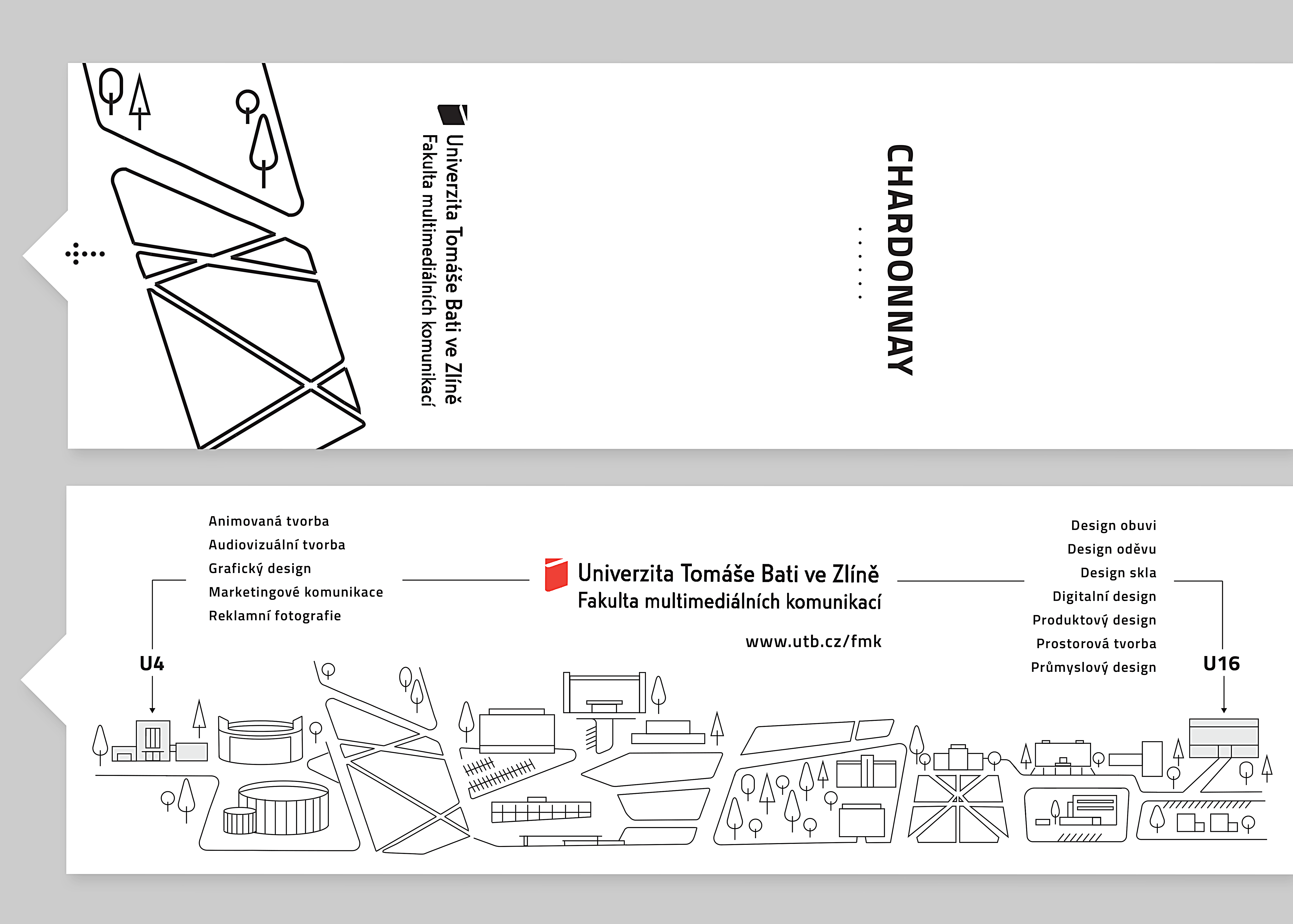 Návrh etikety na víno pro Fakultu multimediálních komunikací / Hlavním motivem je mapa znázorňující lokaci budovy U4 a U16. Etiketa se skládá ze dvou částí - nálepky a přebalu.