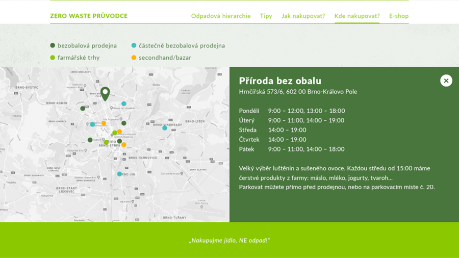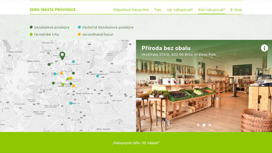 V souvislosti tímto zadáním jsem se zabývala zero waste. Vymyslela jsem dárkový balíček se základní výbavou pro odstartování tohoto životního stylu a navrhla jsem webového průvodce bezobalovým nakupováním (nejen) potravin.