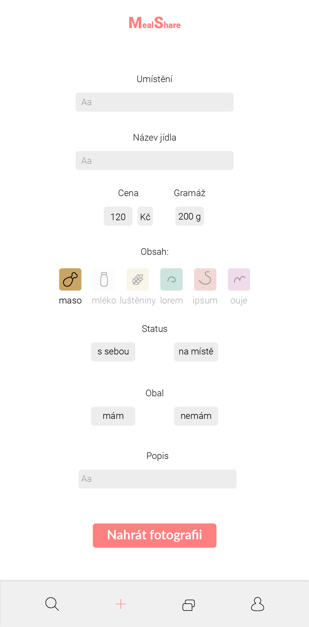 Mým cílem je vytvořit aplikaci, kam lidé snadno nahrají své uvařené jídlo, ke kterému se někdo snadno přihlásí, kde společná večeře/převzetí jídla bude velmi rychle uskutečnitelné.